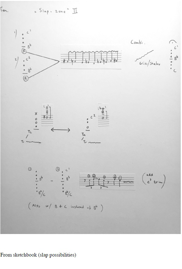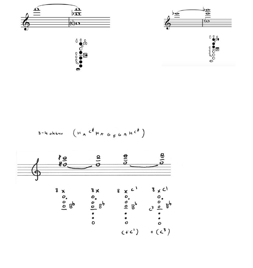 As one can see from the information I have given myself here, it has many other possibilities of being superimposed by ‘further manipulation’ techniques: Under-blow (very low jaw position) in fortissimo creates a ‘duck’ like sound. A high tongue position (vowel- y) can create high harmonics and be very articulated as well. There are glissando possibilities, slap and tremolo tonguing, and trills. Also a combination multiphonic that is both mechanically easy and harmonically interesting. On the bottom note line, at the beginning, there are small notations on a u.b. melody (under-blow with octave key), playing with octave key on, but push the jaw so low down that it creates pitches approximately an octave down (only in some cases, as it can also be a not equal tempered 7th or 9th down.) When played very soft this also creates a reference to ethnic wooden flute. These small melodies occur many places in the mentioned Sea Meet Shore (5:29 for example) They are often a ‘true’ multiphonic since they tend to have contours of harmonics around them.