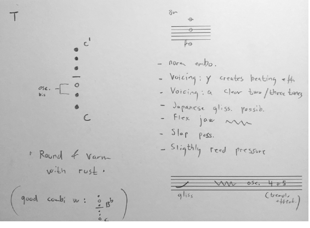 Good for precise articulation/punctuation. Osc. is short for oscillation possibilities and shows which keys. There is also information on ff (fortissimo) trill/tremolo. Finally, it says Shakuhachi possibilities. This means isolating one pitch to use it as a monophonic sound (in this case the fundamental/lowest pitch in the multiphonic) My reference here is the wooden breathy quality of the Japanese flute Shakuhachi.