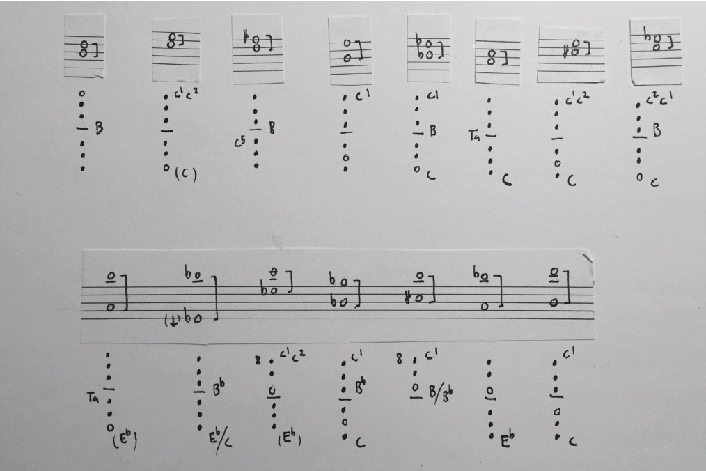 These then, are my multiphonic findings. The file cards contain the fingering charts that work for me – always with an auditory awareness for the poetics. Tabulated in a set of archive cards - a card for each fingering. The notation and information to be found here are only meant to be understood by me and act as a reference in order to be able to reproduce a specific multiphonic I have come across in a rehearsal or performance. This information can be both descriptive and prescriptive. The idea here is to write things down when I find them. Either they get stabilized and incorporated, or they are passed over for the moment, to be further investigated and unpacked later. Thus, I can open the box, pick a card, and wonder: What was that about? What kind of embouchure will unfold this one? Can I add some more information on this one The box acts as something between a notebook and a set of etudes. Made to make sense to me, not to anybody else, it could include anything from subjective notions on physical characteristics (acoustics), how they might be perceived (psychoacoustics), their function and meaning (semiotics and semantics), or their emotional/affective qualities (aesthetics). Practically this usually implies: a) approximately possible pitches of a given fingering b) personal information regarding embouchure c) further manipulation possibilities d) small sketch of possible notation or a little musical gestural idea e) combination possibilities with other multiphonics (cross-referencing) f) symbolic, metaphorical or aesthetic associations/classification (see paragraph 2.4).