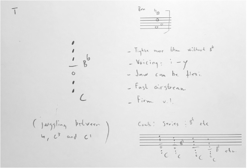 Any classification can give information to help discover connections, significant patterns, contrast or similarities. However, I have discovered that many of the multiphonics overlap into different classification categories depending on the effect the different levels of manipulation have on them. Although I have not classified my multiphonics systematically, I could at times group them for instance according to the aesthetic quality or pitch content. I might then use these in improvisations or composition that yields for a certain coherence in the material, that could be, let’s say a group of breathy/transparent sonics. Another example might be a group of multiphonics where the range and pitch content could be classified and used harmonically or melodically. If not directly classifying the multiphonics, my notations might include: