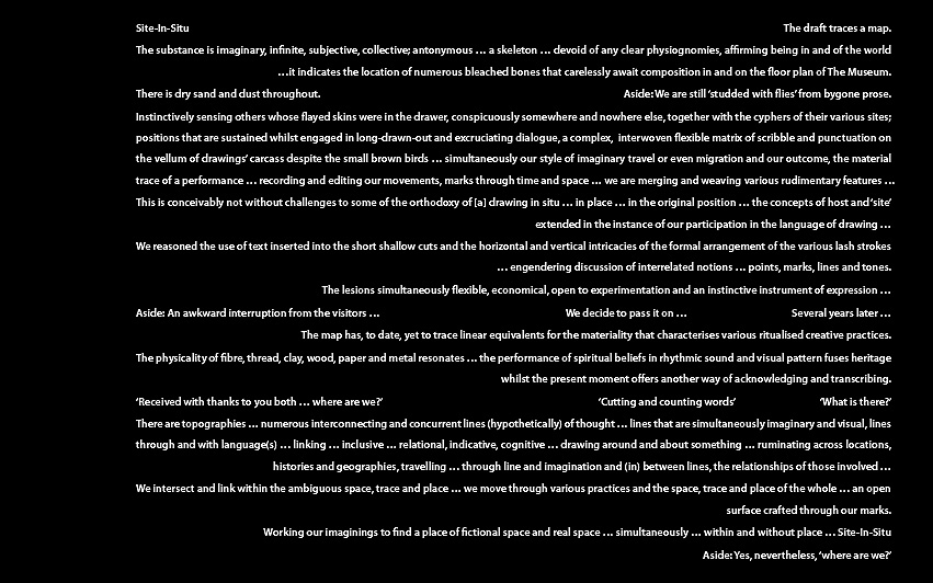 A disambiguation of Particles of Moisture or other Substance Suspended in Air and Visible as Clouds (Kreider and O'Leary, 2015). A staged process. Stage 3: Site, a drawing. The drawing situates Kreider and O’Leary’s characteristics of site (a middle distance; close engagement: material, spatial, temporal, cultural complexity, thereness; afar) and acknowledges movements or spatial practice on the ground (New Walk Museum), experienced phenomenologically and read in all of its semiotic complexity.