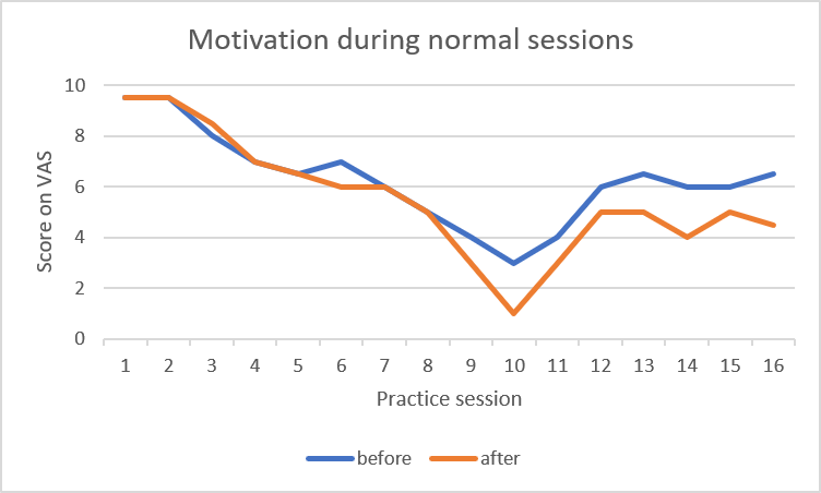 Finally, the extent to which the participant enjoyed the sessions was eventually as expected. At first, the imagery sessions were not really enjoyed but after several sessions they were more enjoyed than the normal sessions. This was as expected. The extent to which the participant enjoyed the normal sessions was much more influenced by external factors.