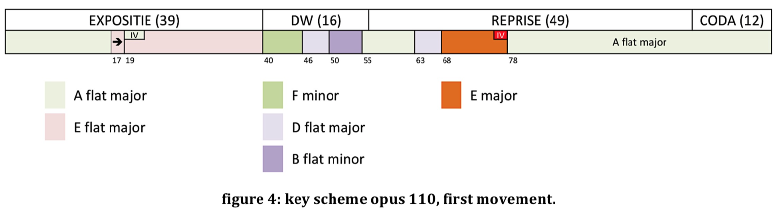 In figure 4 we can see an overview of the keys in the first movement. The player can choose the keys in which to practice the preparatory exercises that day, making sure they cover all keys every two or three days and ordering the keys by their significance in the first movement. It is evident that A flat major is more significant then B-flat minor.