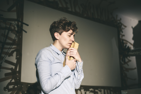 What does the musician become when sound and instrumental thinking are no longer privileged as the foundation of a musician's practice? In what ways does an emphasis on the musician's body cause music to approach art forms such as theatre and performance? After a generation of pioneering work from Mauricio Kagel, Dieter Schnebel, John Cage and many others, where is the theatrical and the performative in music today? How do its recent developments shape, alter, constitute a musician's artistic practice? Through her research, Jennifer Torrence argues that this type of music demands the musician assume a different understanding and relation to their instrument and therefore a different relation to their body. This relation calls for new ways of making and doing (new artistic practices) that foreground the body as a fundamental performance material. Through an emphasis on the body, the musician emerges as a performer. This exposition is a reflection on the research project Percussion Theatre: a body in between. This project is comprised of a collection of new evening-length works that approach the theatrical and performative in contemporary music performance. These works are created with and by composers Wojtek Blecharz, Carolyn Chen, Neo Hülcker, Johan Jutterström, Trond Reinholdtsen, François Sarhan, and Peter Swendsen. The exposition contains reflections on recent developments in contemporary music that mark a mutation of the executing musician into a co-creating performer, as well as images, artefacts, videos, and texts that unfold the process of creating and performing the work that constitutes this project. The ambition of this exposition is that through the exposure of a personal artistic practice an image of a larger field may come into focus.
