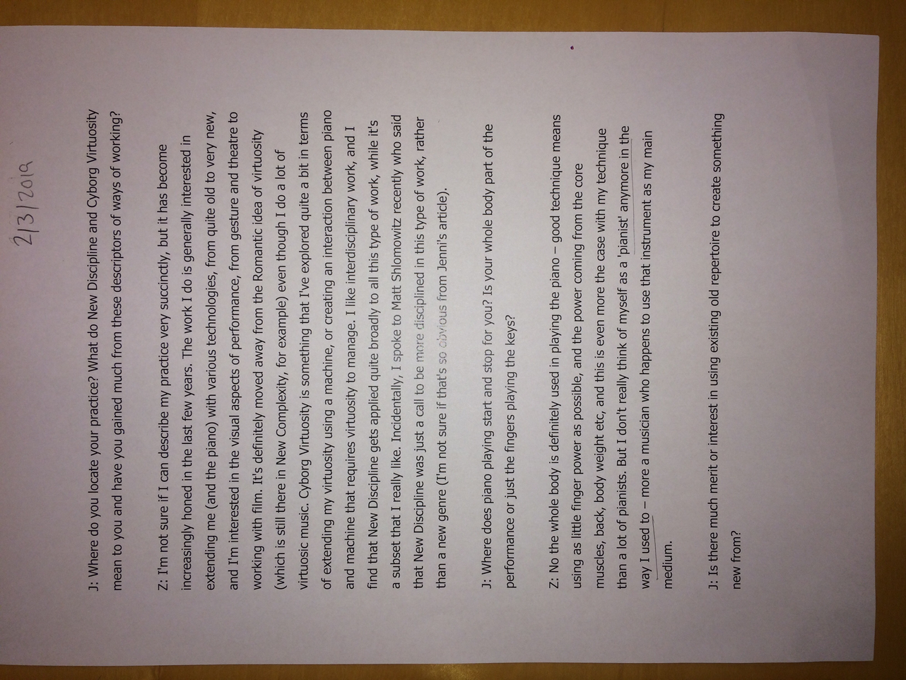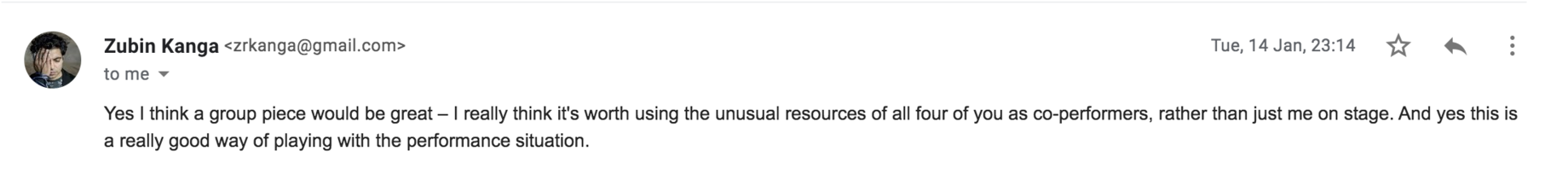 The rather surprising upshot of this process of collaboration between not just myself and Zubin Kanga but also Bastard Assignments, is that I need to compose the material more and hammer things down. This means choreographing, notating, and making decisions by myself. Sadly this is because of time contraints and practical issues. It would be easy to not include this project within my research but I find its inclusion interesting because it became clear that more was required of me. My taking the lead as composer and decision-maker is a result of collaboration and conversation.