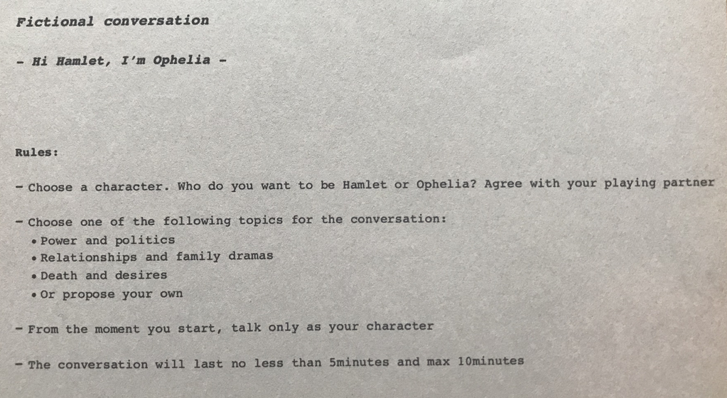 These conversations are the result of an invitation to take part in a role-game. The volunteer participants choose one character between Hamlet and Ophelia, and one of the proposed topics for a conversation. Through this staged situation I have been observing how the borders of whom is talking can become blurry and undefined: is it the voice of the character, of the person, of the person enacting? What interests me is how the game can produce a subjectivity that arises from the navigation between the personal and fictional character. Can the constant intra-movement between different voices, bodies and imaginaries become fluid and manifest? What spaces, imaginaries, bodies and subjectivities are produced through the multiple intra-action?