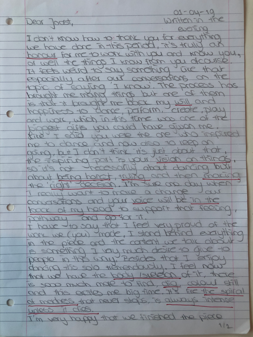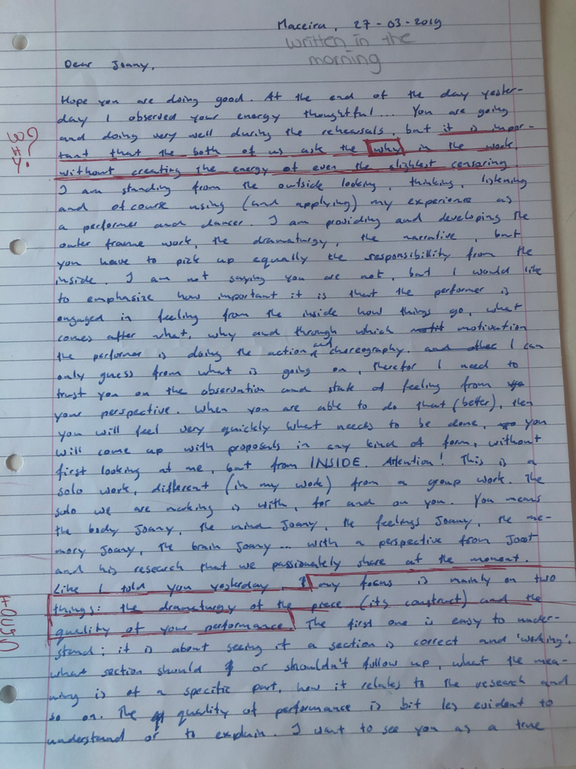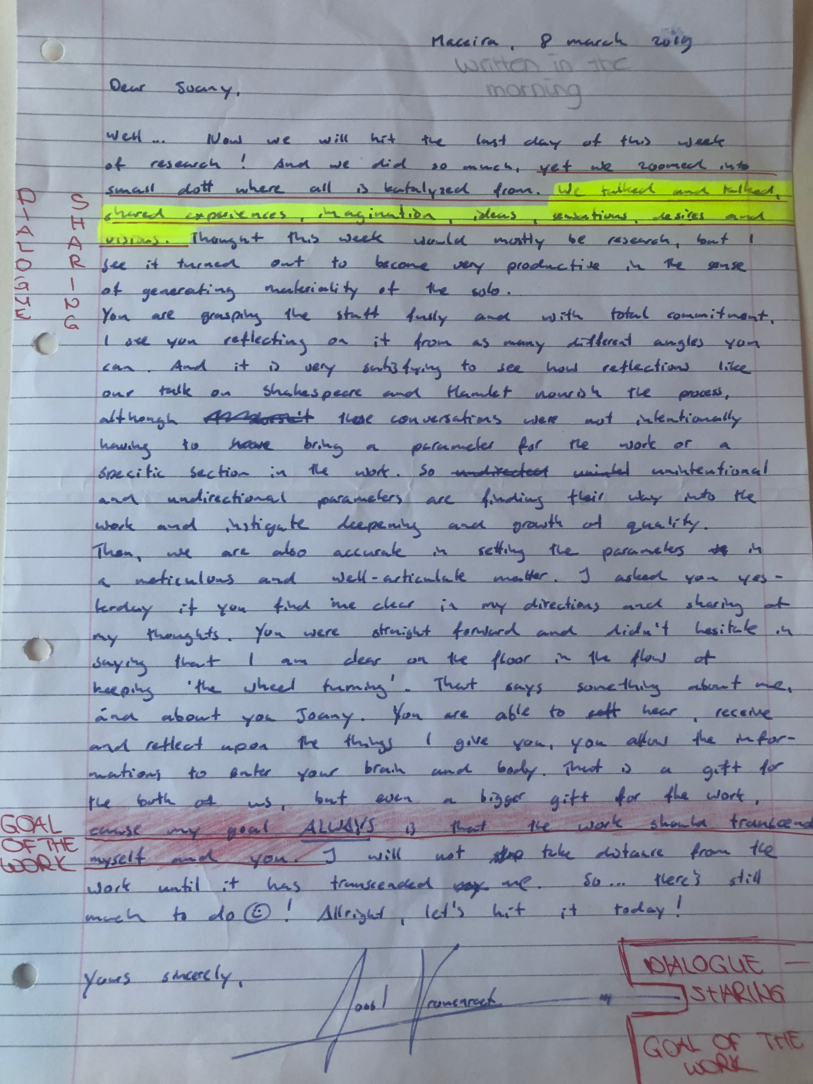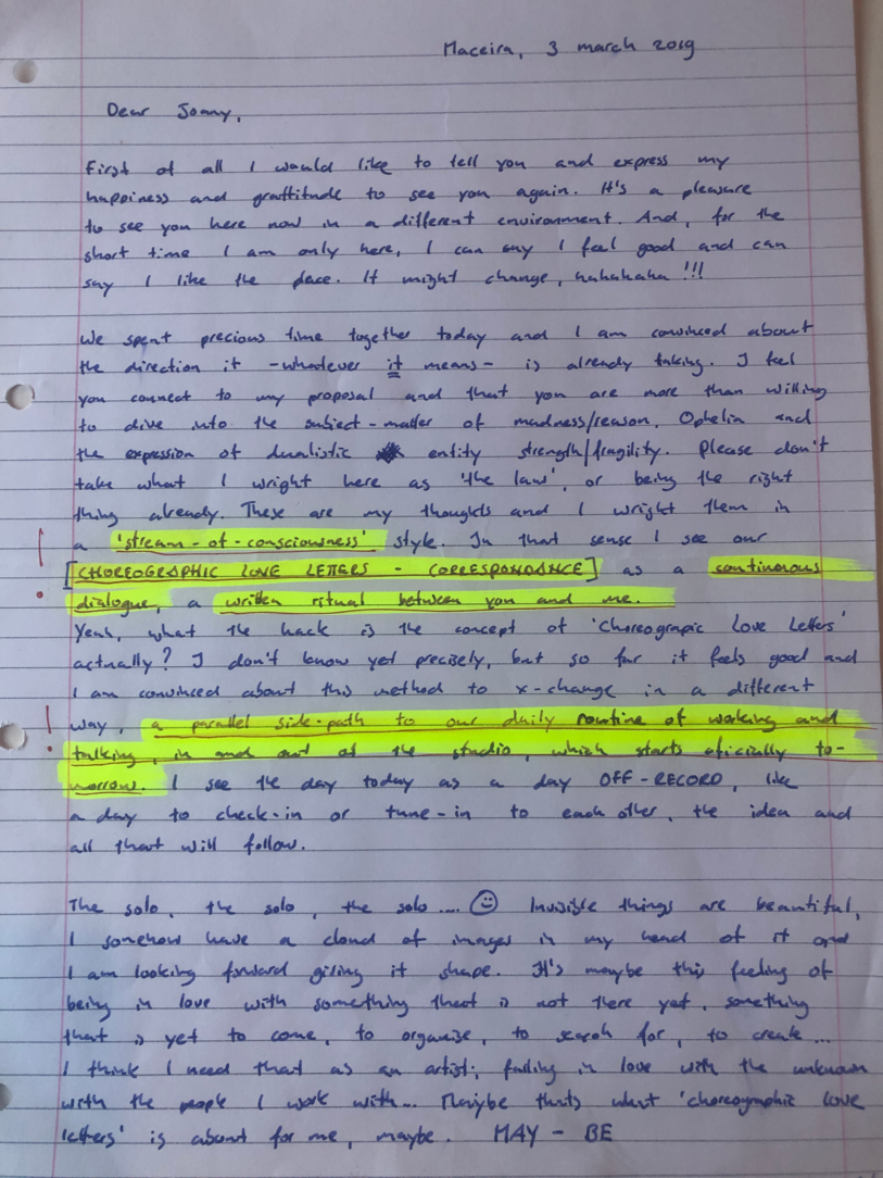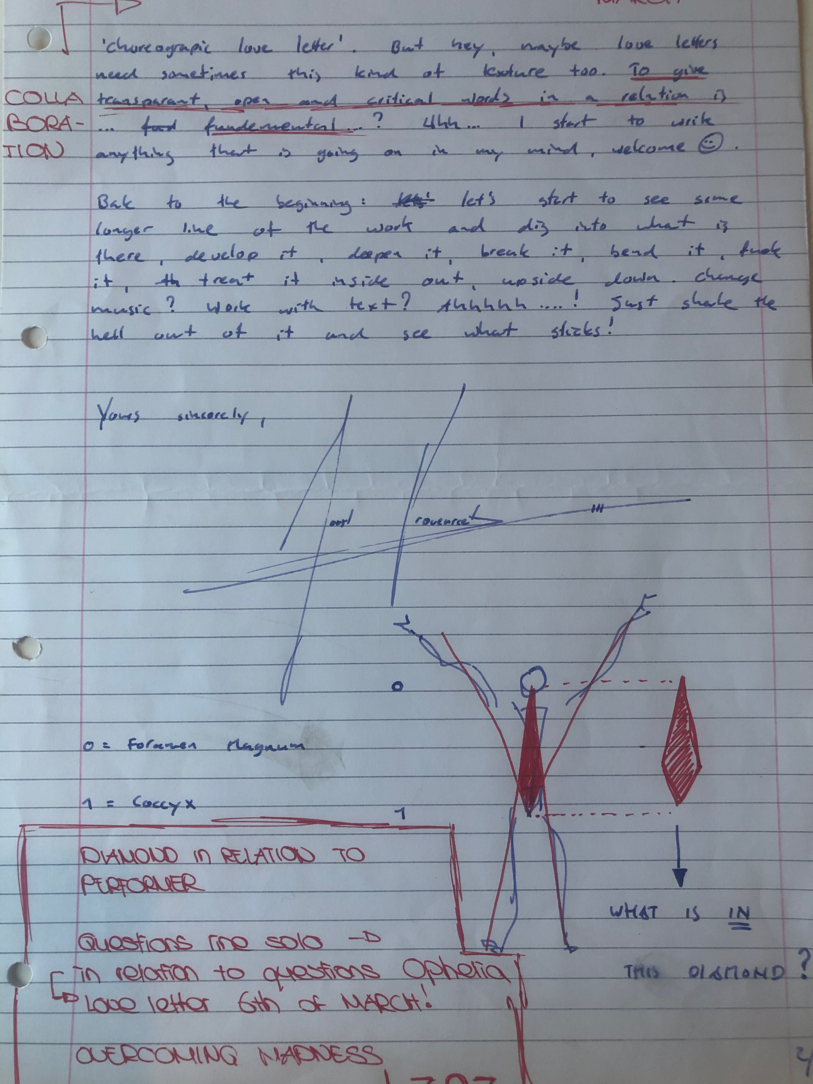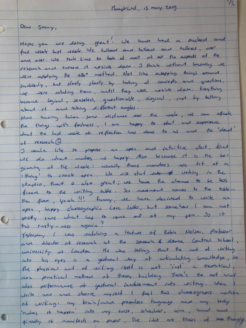 Choreographic Love letters is a method which I coined as an alternative, creative way of correspondence which supports the flow of thinking during the process, in between the rehearsals. The writing is done in a way to reflect upon what has been done during the rehearsals, sharing the thoughts of the studio moments and forwarding thoughts that feed into the coming rehearsals afterwards. Choreographic Love Letters is a form of continuous dialogue between the creatives involved in the process by hand-written letters.