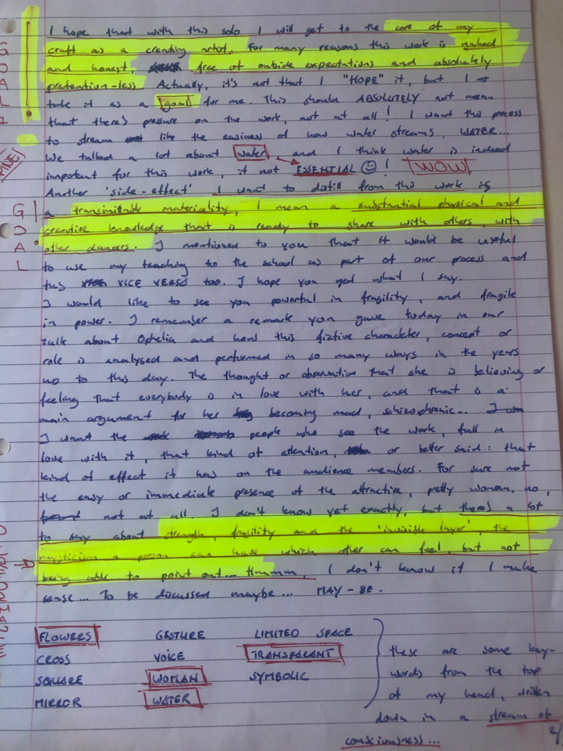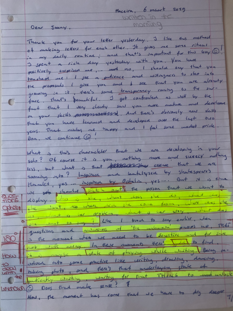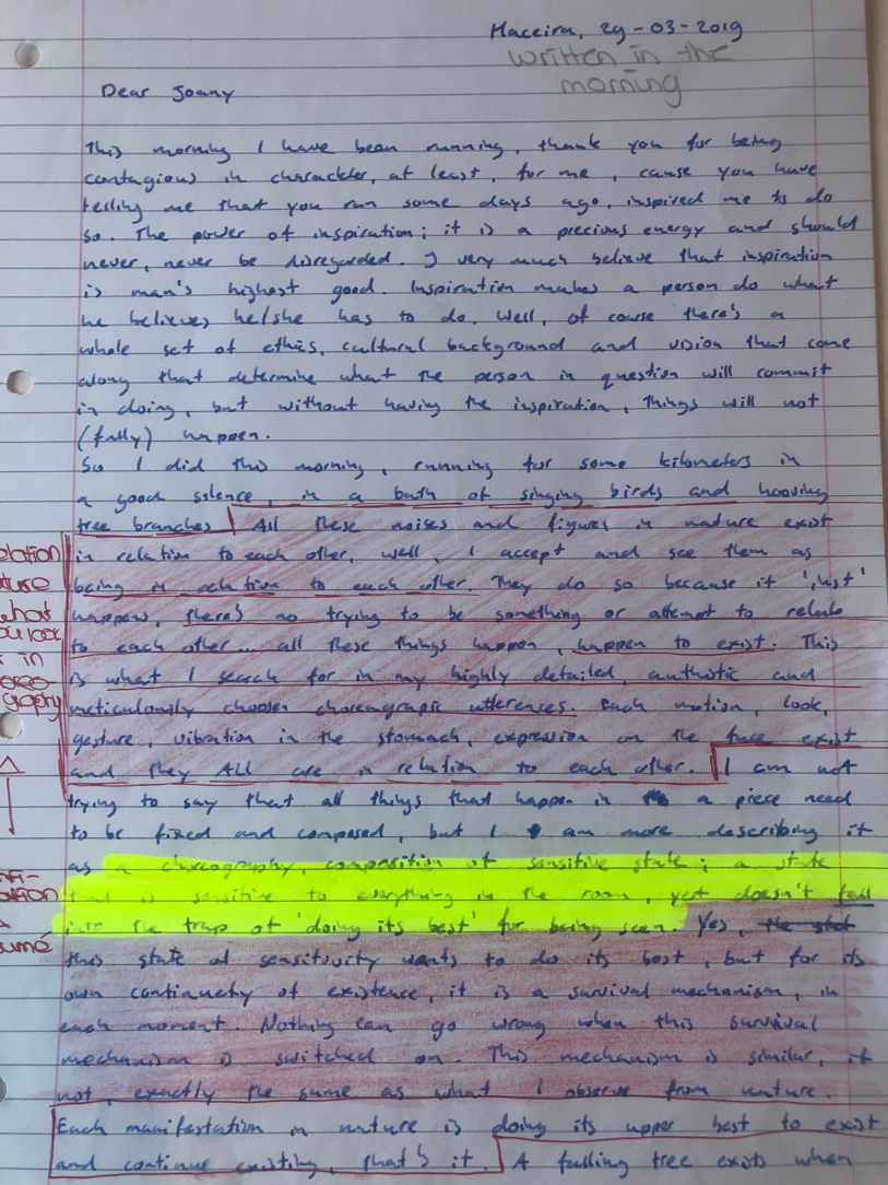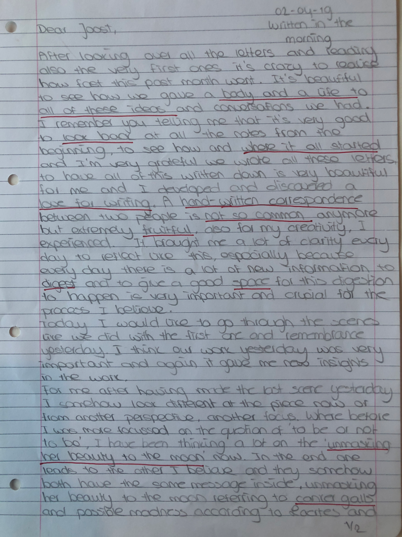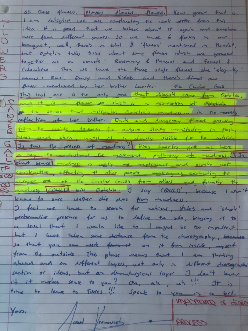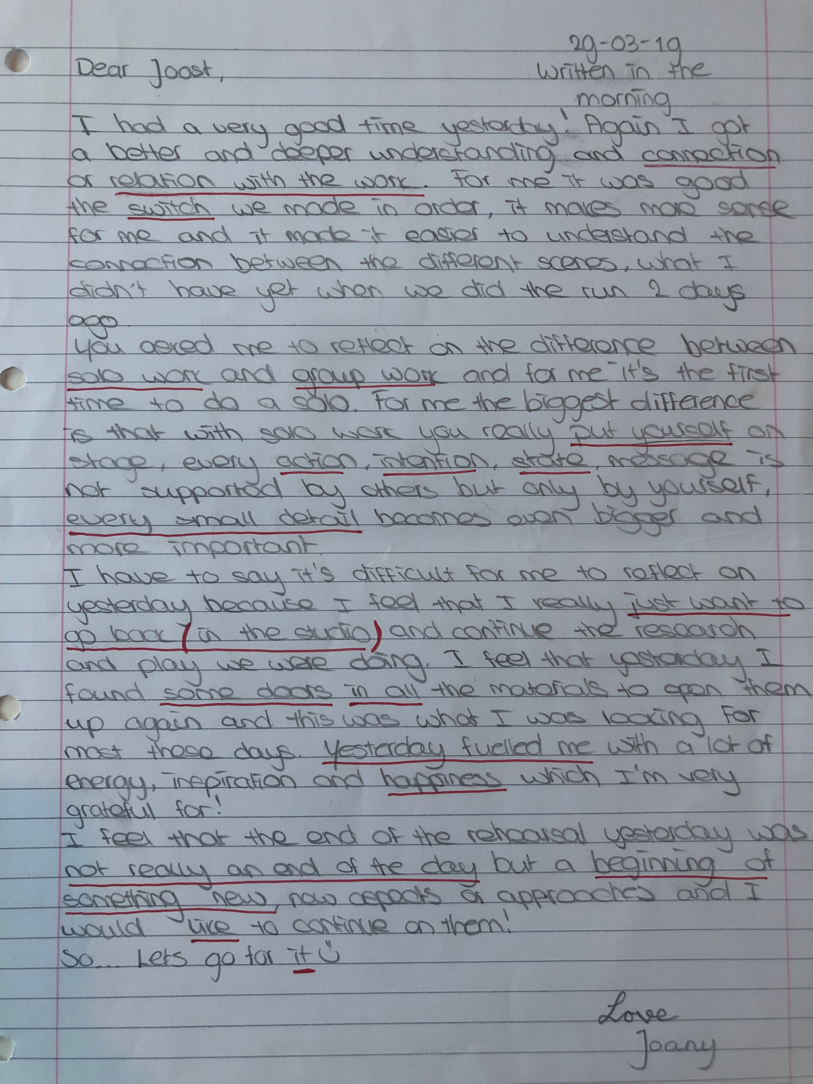 Choreographic Love letters is a method which I coined as an alternative, creative way of correspondence which supports the flow of thinking during the process, in between the rehearsals. The writing is done in a way to reflect upon what has been done during the rehearsals, sharing the thoughts of the studio moments and forwarding thoughts that feed into the coming rehearsals afterwards. Choreographic Love Letters is a form of continuous dialogue between the creatives involved in the process by hand-written letters.