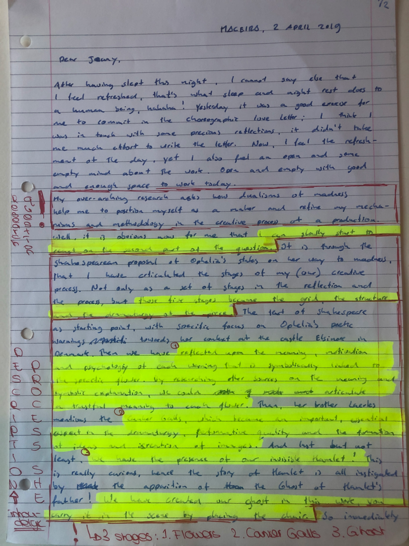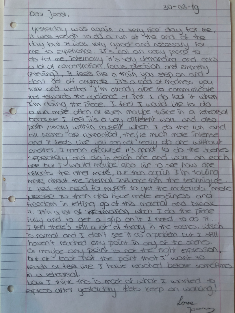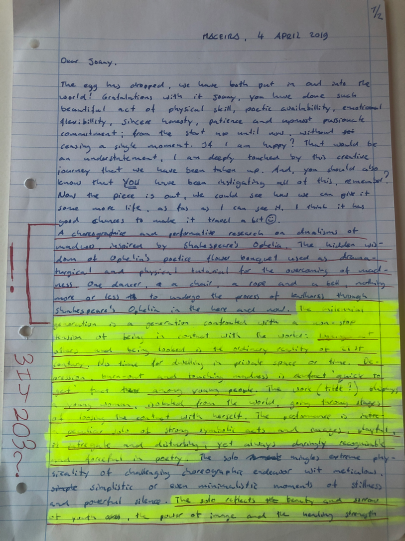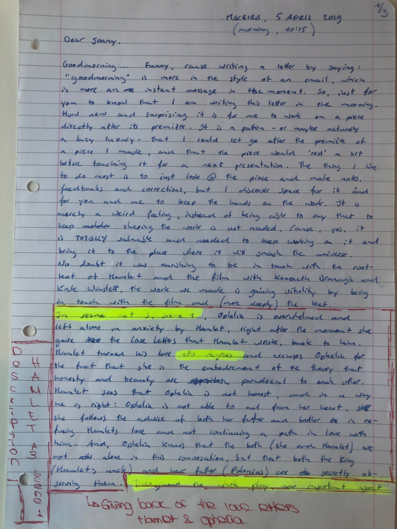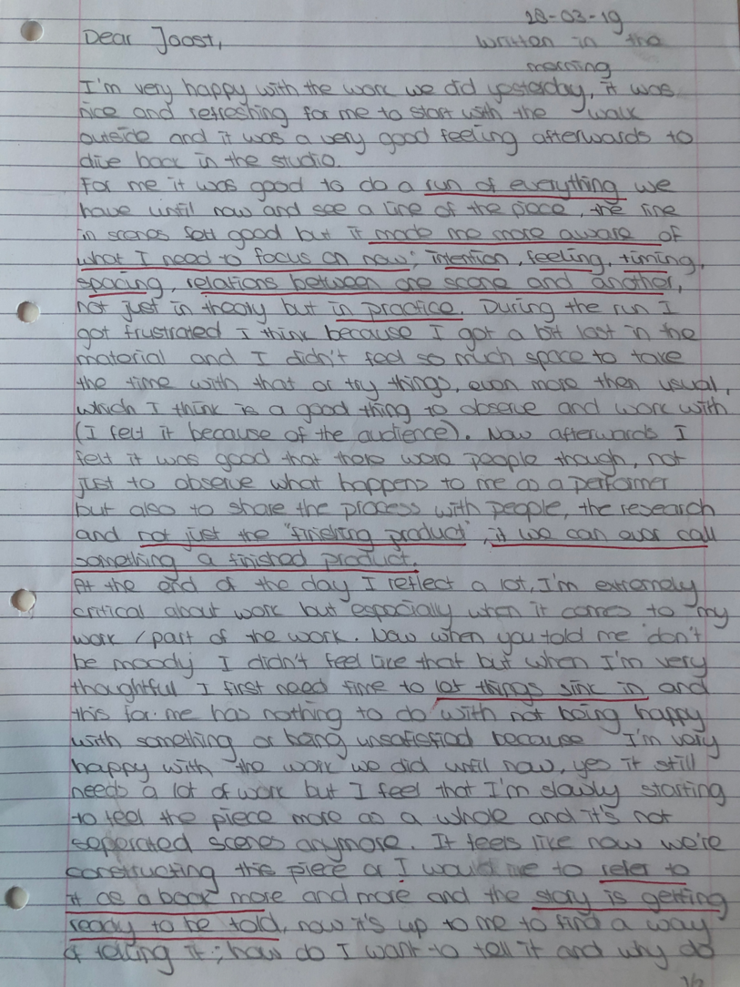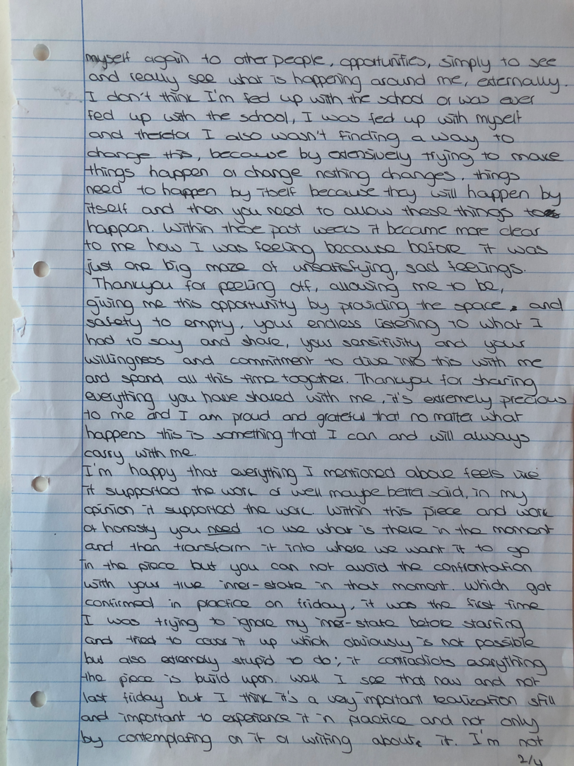 Choreographic Love letters is a method which I coined as an alternative, creative way of correspondence which supports the flow of thinking during the process, in between the rehearsals. The writing is done in a way to reflect upon what has been done during the rehearsals, sharing the thoughts of the studio moments and forwarding thoughts that feed into the coming rehearsals afterwards. Choreographic Love Letters is a form of continuous dialogue between the creatives involved in the process by hand-written letters.