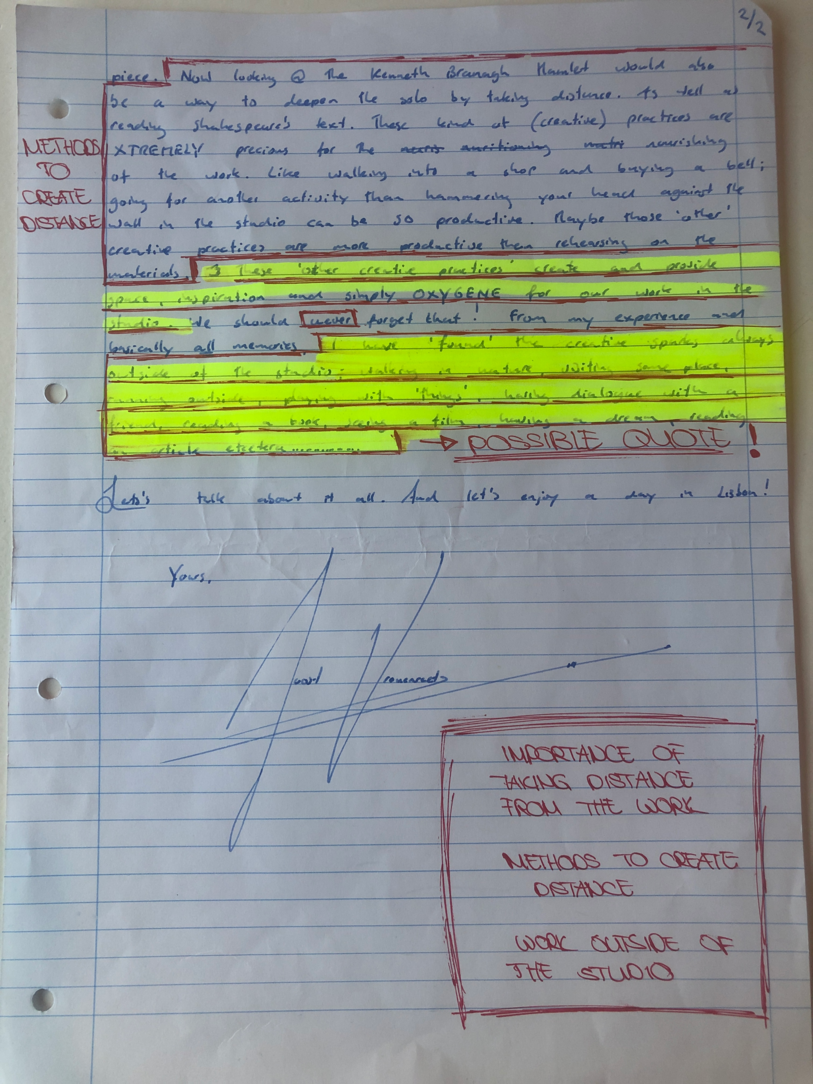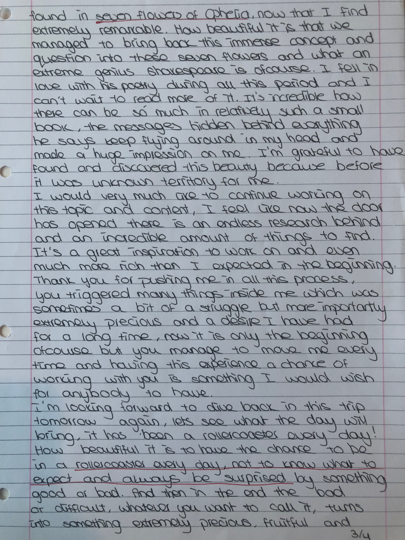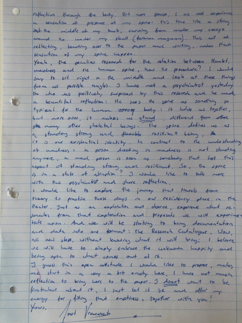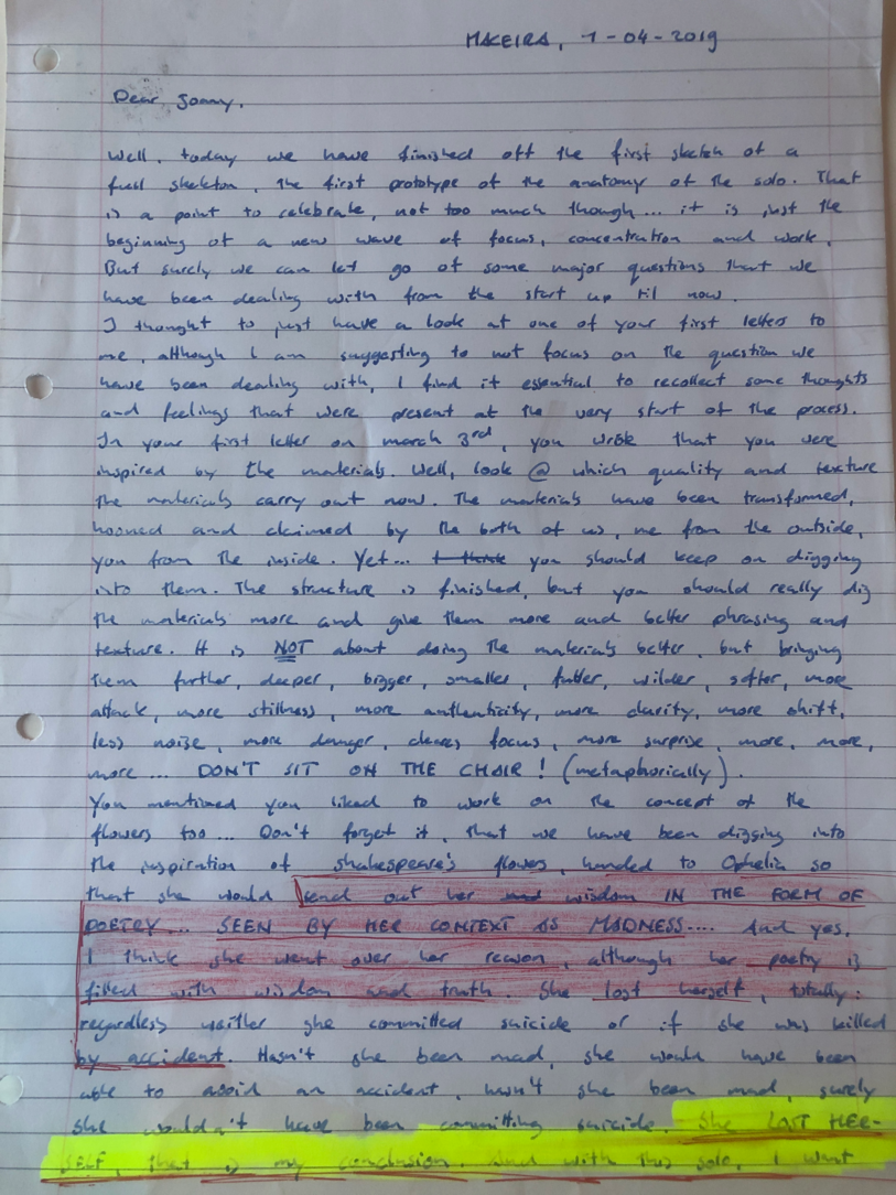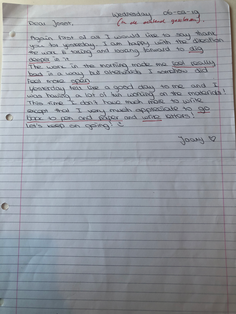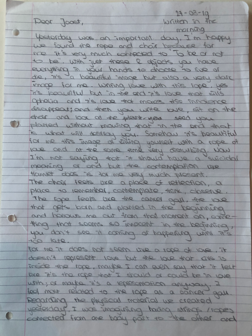 Choreographic Love letters is a method which I coined as an alternative, creative way of correspondence which supports the flow of thinking during the process, in between the rehearsals. The writing is done in a way to reflect upon what has been done during the rehearsals, sharing the thoughts of the studio moments and forwarding thoughts that feed into the coming rehearsals afterwards. Choreographic Love Letters is a form of continuous dialogue between the creatives involved in the process by hand-written letters.
