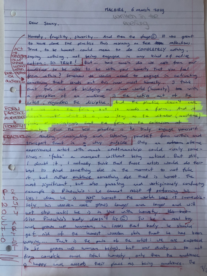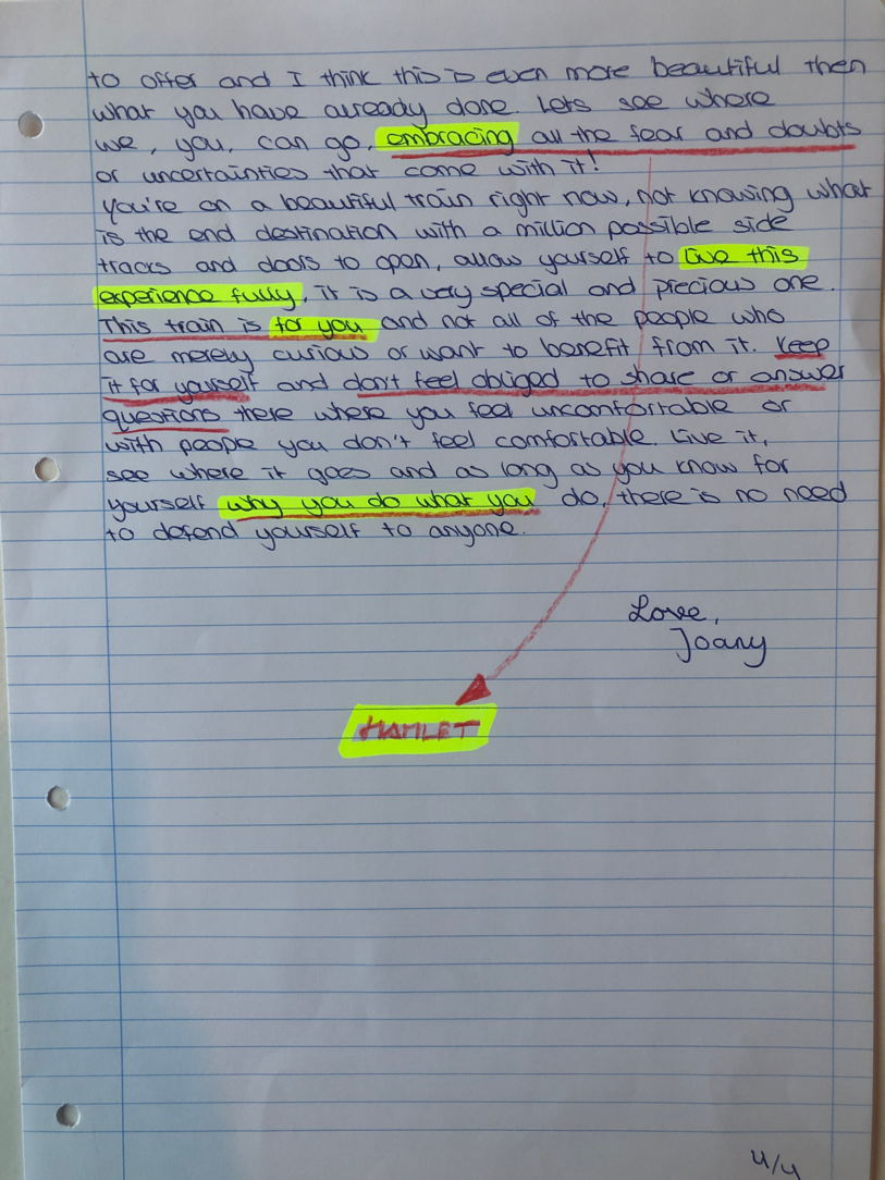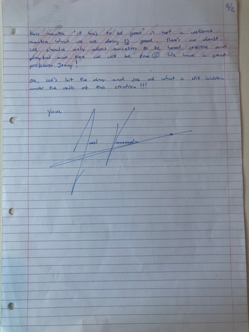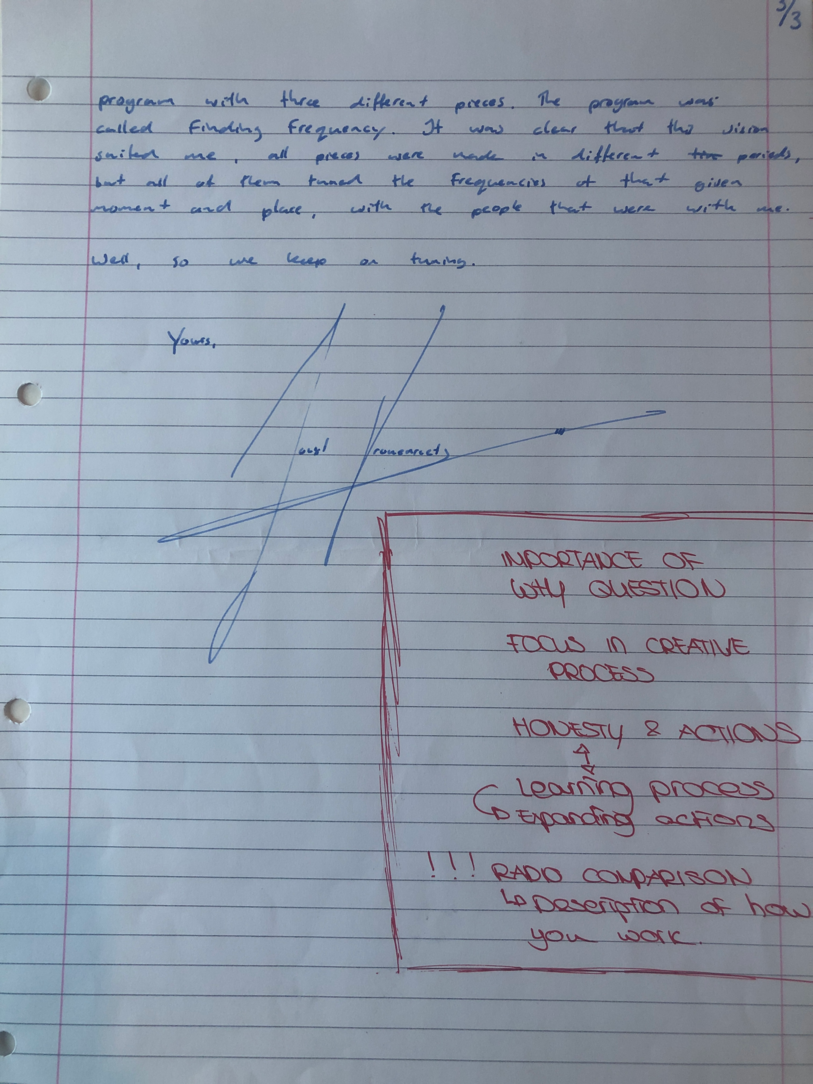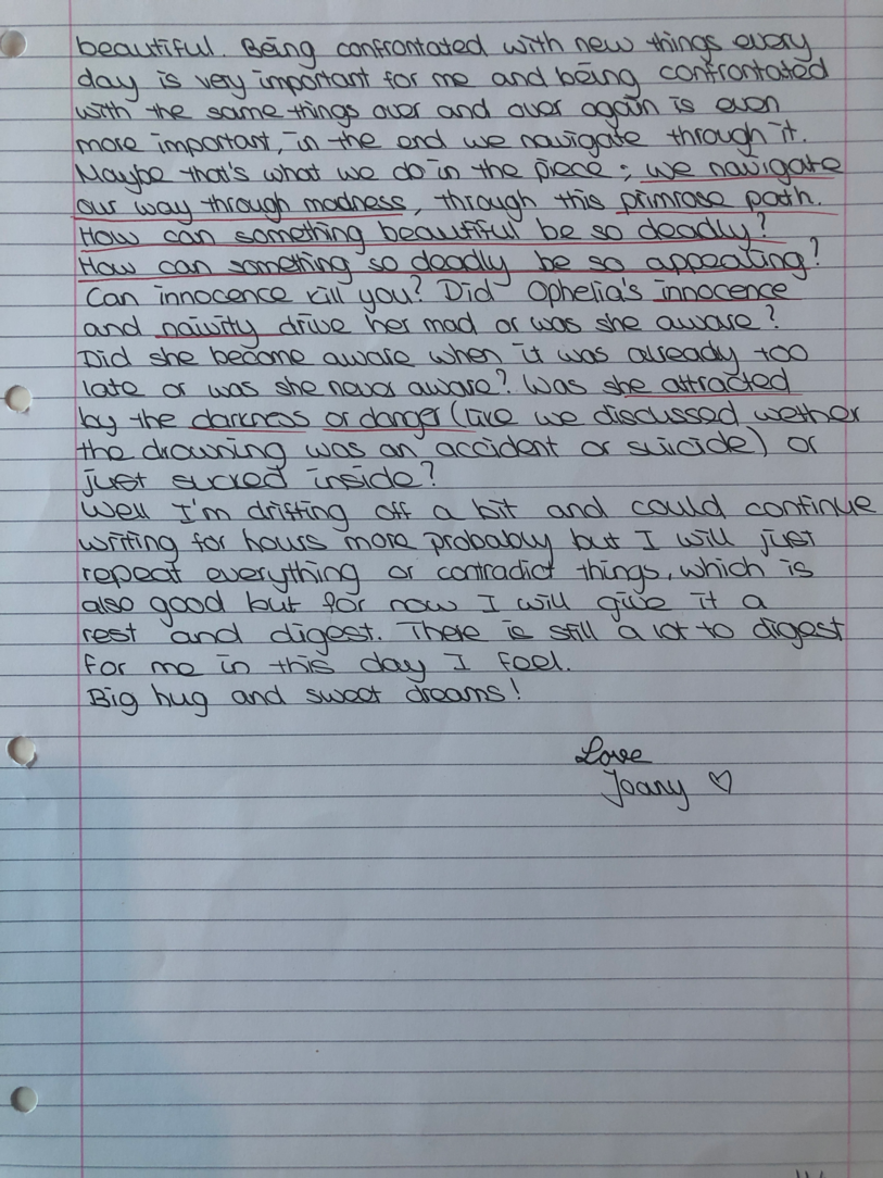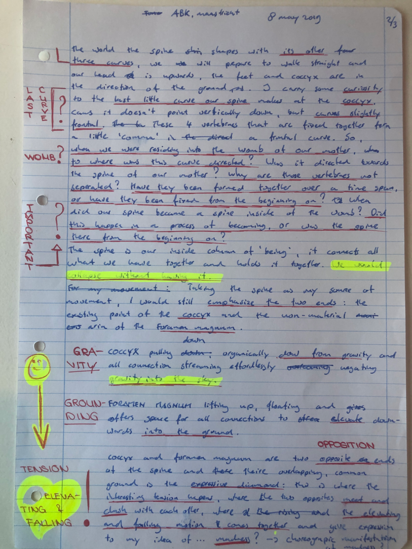 Choreographic Love letters is a method which I coined as an alternative, creative way of correspondence which supports the flow of thinking during the process, in between the rehearsals. The writing is done in a way to reflect upon what has been done during the rehearsals, sharing the thoughts of the studio moments and forwarding thoughts that feed into the coming rehearsals afterwards. Choreographic Love Letters is a form of continuous dialogue between the creatives involved in the process by hand-written letters.