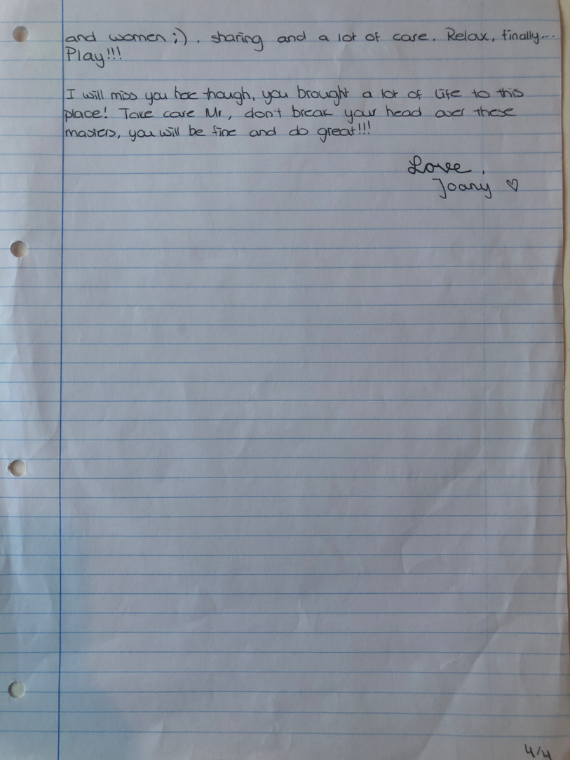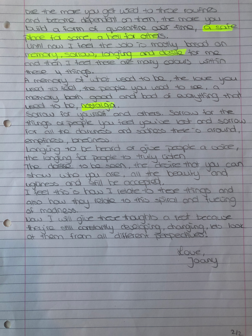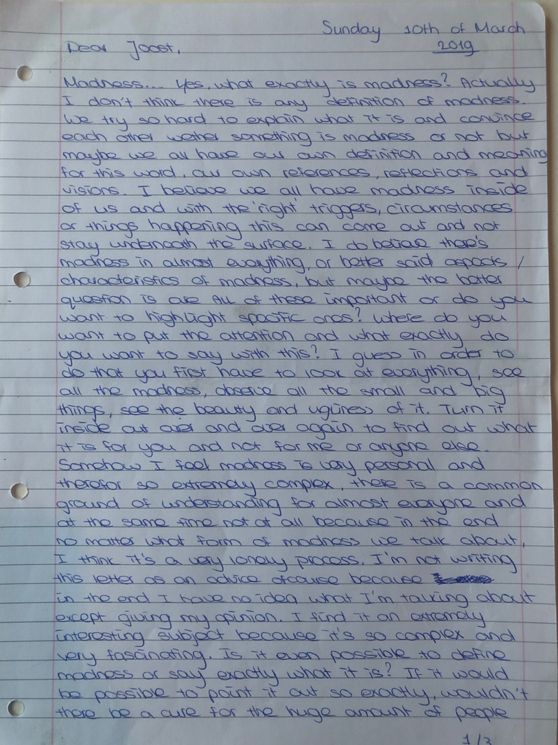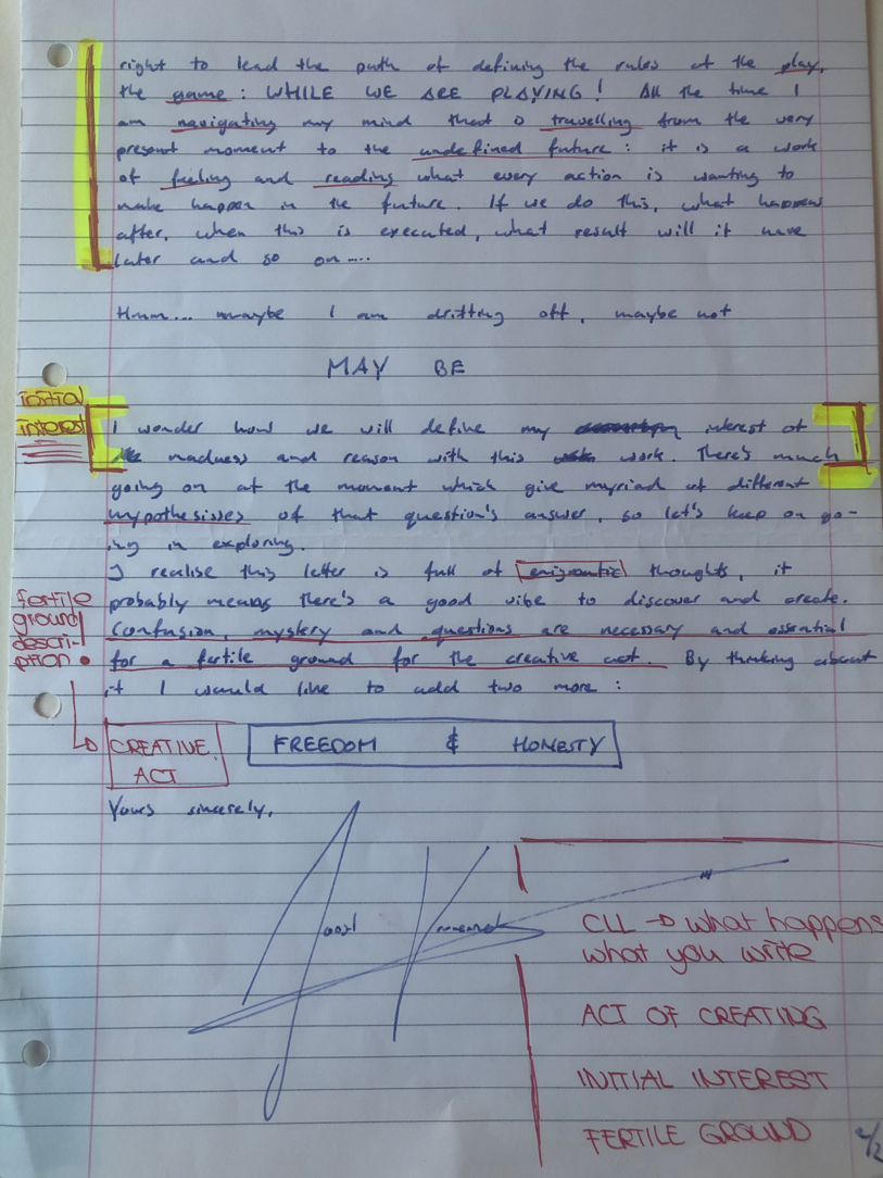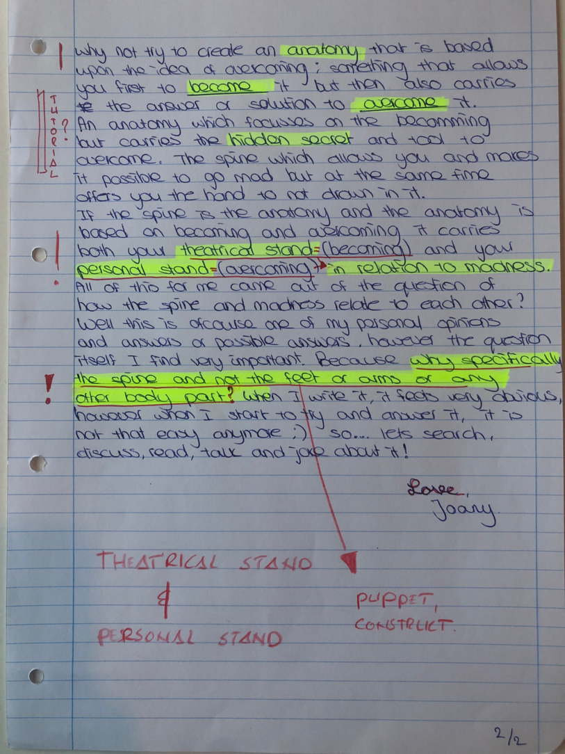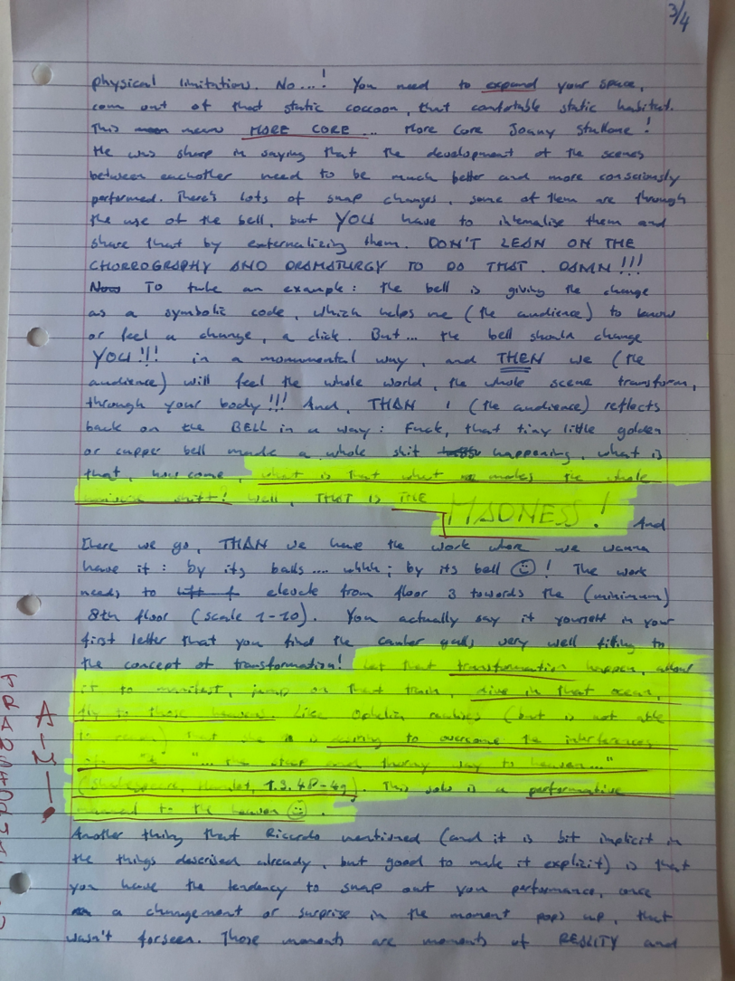 Choreographic Love letters is a method which I coined as an alternative, creative way of correspondence which supports the flow of thinking during the process, in between the rehearsals. The writing is done in a way to reflect upon what has been done during the rehearsals, sharing the thoughts of the studio moments and forwarding thoughts that feed into the coming rehearsals afterwards. Choreographic Love Letters is a form of continuous dialogue between the creatives involved in the process by hand-written letters.