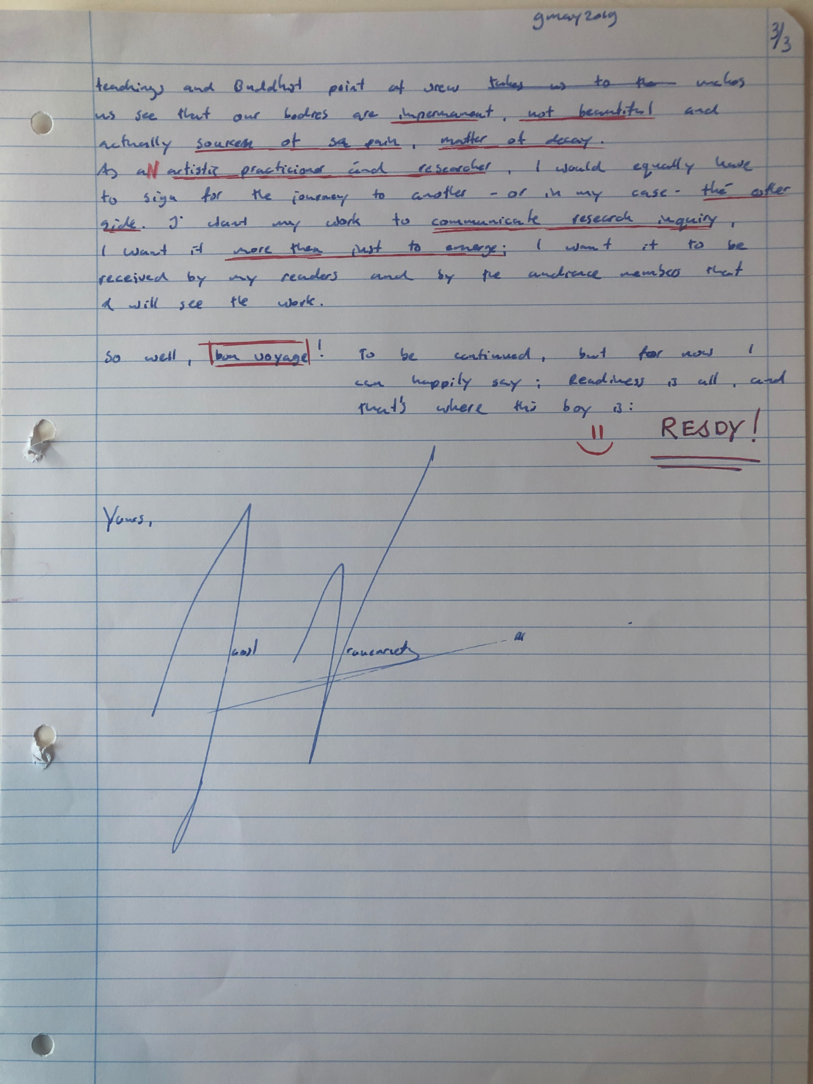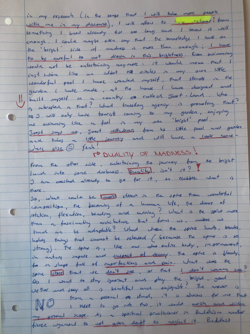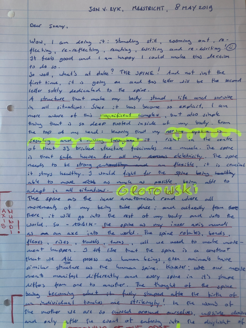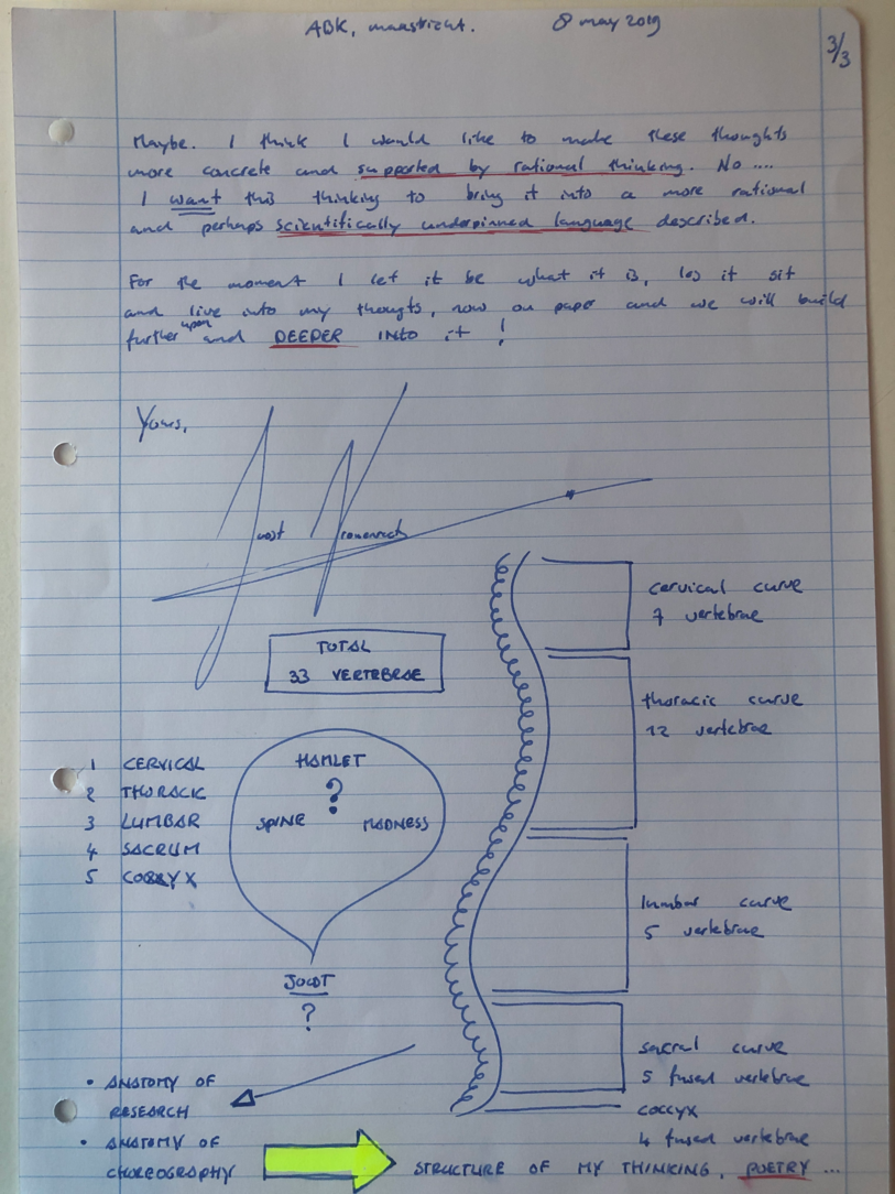 Choreohgraphic Love Letters is a parallel side-path to the daily routine of working and talking, in and out of the studio. Professor Robin Nelson, director of Research at the Central School of Speech and Drama of the University of London mentions in a lecture the need of ‘complementary writing’; a writing that takes place during the research inquiry as a practitioner researcher. Complementary writings support and influence the formation of the conceptual framework of the research. He uses the word complementary, because the writings compliment the performative practices. Similar to what he explains, the method of Choreographic Letters is a complementary practice of writing which supports and compliments the practices during the research.
