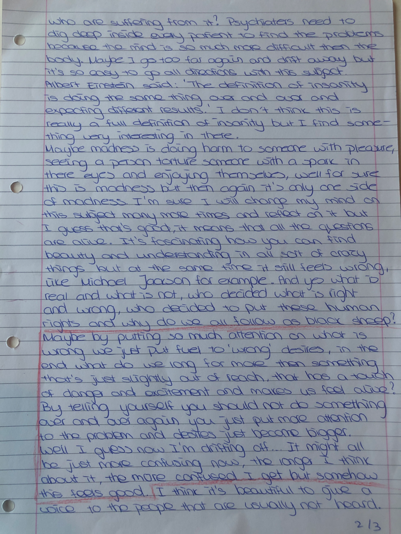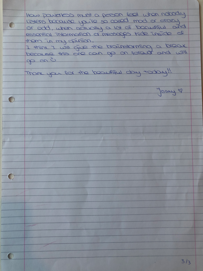 “Time transforms when I write; it transforms the quality thinking, I think I go deeper in my thoughts. When I write I ACTUALLY take the time to observe what is really inside of myself in terms of emotion, reflection and any kind of sensation that I feel like sharing…”
