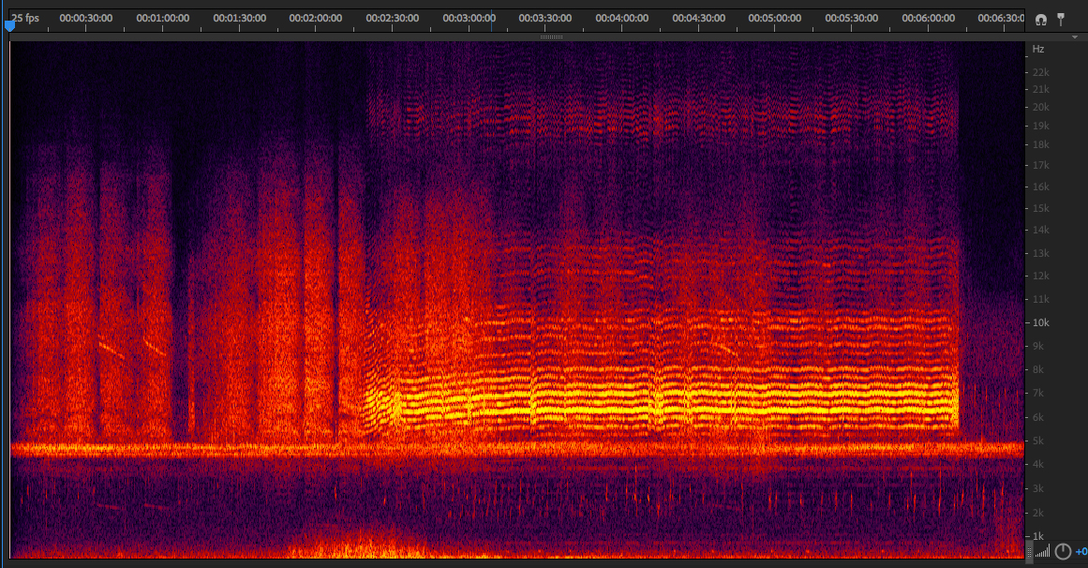 Jonathan Sterne describes in his essay „The mp3 as a cultural artifact” the strategies through which the decisions are being made which information to ignore and which to keep, one being the change in energy in the different spectrums. This analysis is then used in order to decide, which are the important frequencies. Here is a picture to illustrate why for cicadas this might not be possible: