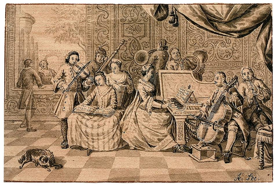 Nothing can inform a researcher better than a picture. I started to seek horn iconography of the XVIIIth century very early in my research and did not know what to expect. The results are extremely uplifting. Here are some of the pictures I found, dated from around the 1760’s to a few years after Mozart’s death. Most of them come from the Facebook group « Portraits of Unknown Baroque & Classical Era Musicians », and the very recent iconography website of John Manganaro1.