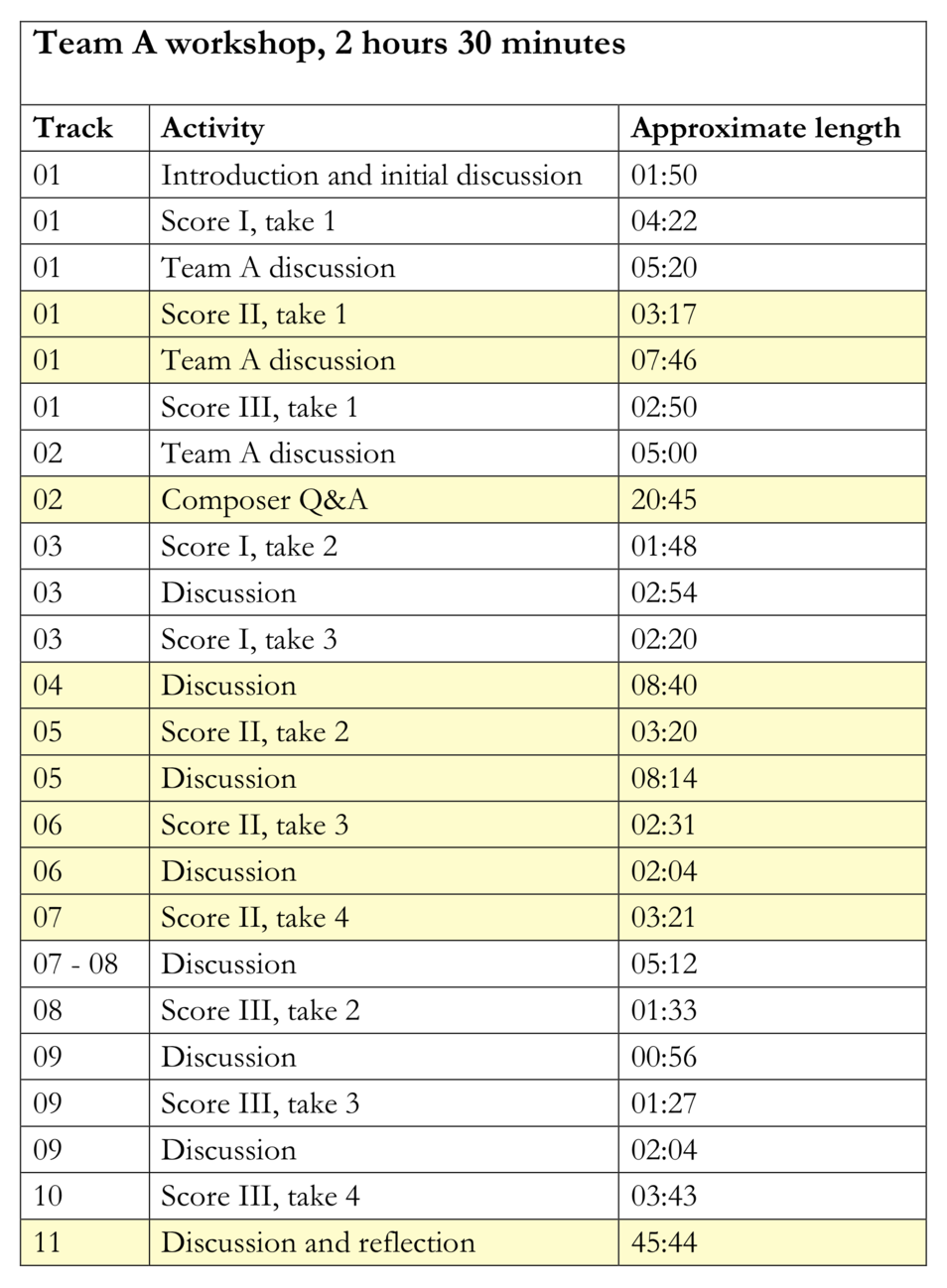 In the Team A workshop, which lasted approximately two and a half hours, the three original scores for Pieces for Four Traditional Musicians were explored in rotation through performance ‘takes’ interspersed with discussion. In total, Team A performed four takes of Scores I and II, and three takes of Score III.
