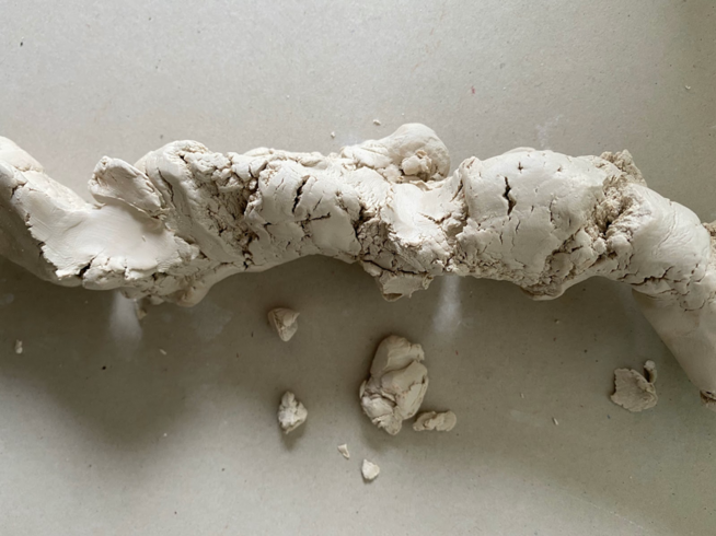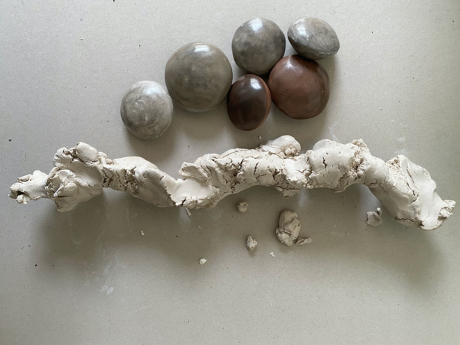 In an exercise such as pebble making, the body itself becomes a part of the rhythm. Like walking, pebble making is an exercise that doesn’t require our usual thought activity, yet provides a movement, a tactile rhythm to rest our attention within. We begin to settle within the rhythm of the process, moving inwards with each rotation. The simplicity of the action we are repeating enables a sense of observing the experience, noticing the sensations. In the case of the pebble, we can see the evidence of this in the marks, the movement of the material following the rhythm of our palms, and vice versa.