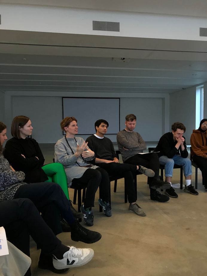 Reflection circle: inside the gallery space we place chairs in a circle-shape to share with the group our own embodied experience based on the (co-created) walking experience.