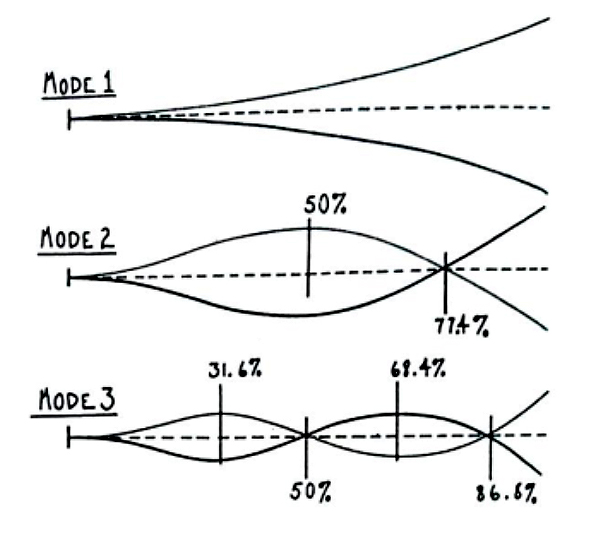 Figure 2. The first three modes of vibration for a rod fixed at one end. We can see that the nodal and antinodal points do not correspond to harmonic divisions in integer parts of the lengths. (Hopkin 1996: 40).