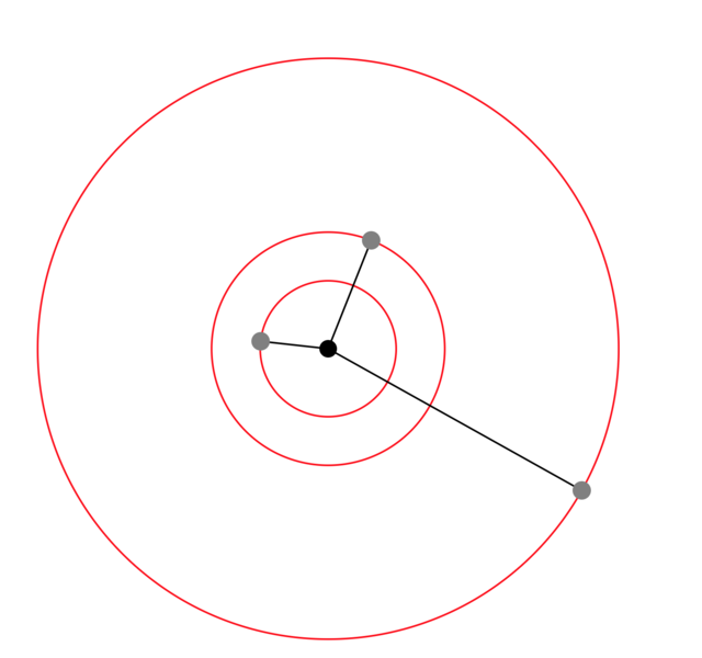 The default configuration of the sources is isomorphic to the loudspeaker constellation in the installation, but reduced to two dimensions and ignoring the orientation of the loudspeakers (i.e. the sources are omnidirectional and arranged in a plane). It corresponds to a top view of the loudspeaker constellation (cf. figure 1). The distances between each sound source and the listener are represented by straight lines from the source to the listener (cf. figure 2) and optionally by circles centred on the listener and passing through the sources (i.e. the radius of the circle represents the distance). This exposes the patterns of ratios between the distances (cf. figures 3, 5, and 6).