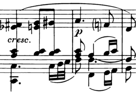 The seemingly peaceful opening of the movement is both contradicted and confirmed by a V-pedal (a stagnation on a tense chord=an harmonic oxymoron) throughout the first hypermeter (mm.1-4), only to be broken by the crescendo and sudden rise of the pedal, influenced by the chromatic motion of the right hand. All parameters seem to be leading toward a (this time) truly peaceful phrase, with softly moving harmony : indeed it is what we have in the following bars (b.6)