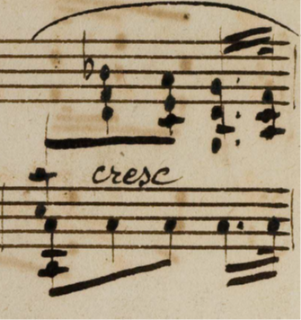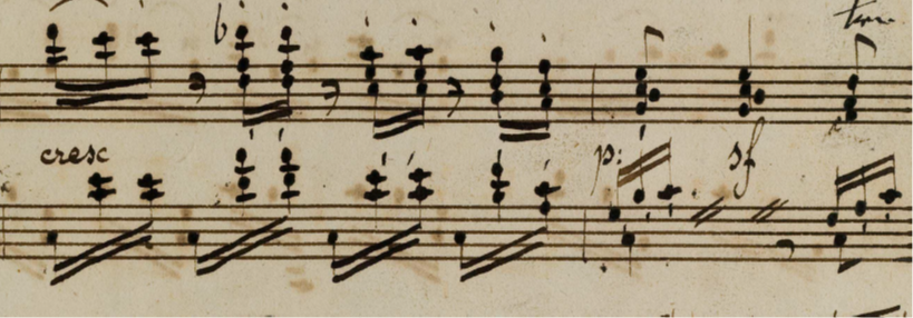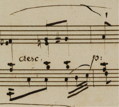 here is the opening of the manuscript of this movement. In it, each hand is given a dynamic, and while the expressive and rhetoric markings (sf and staccato) belong to the right hand, these should not influence the simplicity of the left hand. But perhaps Beethoven wrote a crescendo in bar 4 because the left hand leaves the right hand alone so as to expose the chromatic line more clearly, thus creating a gap in the sound – filled by the crescendo. I do not think this crescendo should bring any tension with it – and the density of the diminished chord, in its voicing, brings enough power so as to not overdo it. I also think that the novelty of the larger two-bar slur is prioritary to the other parameters. It would seem rather ungraceful to have such a lilting motion and long movement be stopped so early in its course.