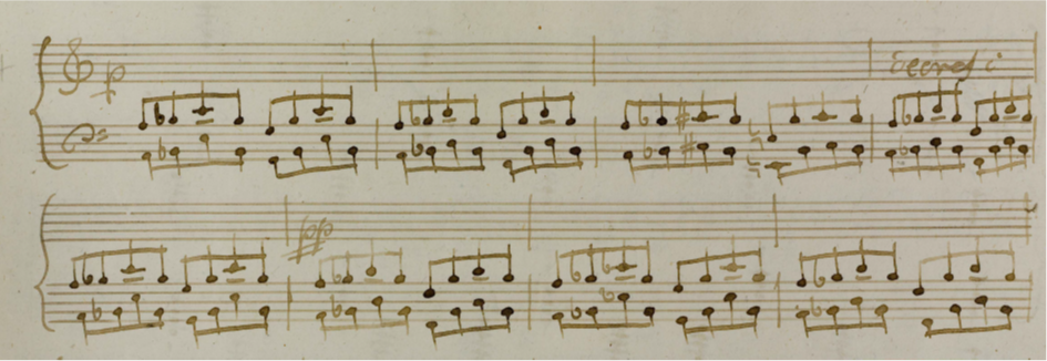 bar 115 : Adagio here means at ease, in sound rather than only in tempo, the second theme, having just been exposed in a very soft dynamic (p dolce, p several times). The crescendo over one note recalls van Oort’s interpretation of Mozart’s text (van Oort 2016: 76) : this chord is immediately stronger, requiring a slower pace between chords so that the sound can fade out toward the p on the fermata. The violin, bearing a slur over those two bars, may use a messa di voce to further the contrast between instruments and the grace with which the music falls into the cadential G major chord.