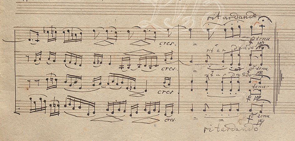 In the second fermata, the diminuendo starts right away, since a crescendo precedes this forte, the summit of this curve doesn’t need a further reinforcement in this very suave section of the quartet. This will help us understand the fermatas that follow quick runs, and how to deal with their preparation.