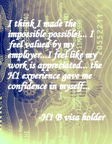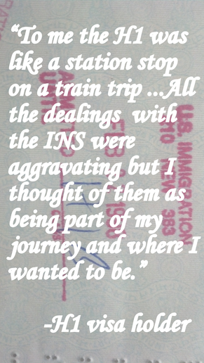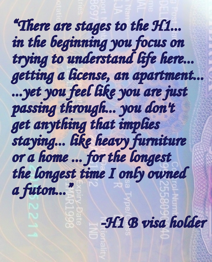 I began to construct images using the photo editing tool on my computer and superimposing the visa pages with representative narrative quotes. It felt appropriate to use digital media to create the composite images because many of the visas were given to computer or software technology professionals. Below are some images that include the background of the visa on the passport with representative quotes from the interviewees superimposed on them. The quotes relate to the themes that emerged from the interview narratives.