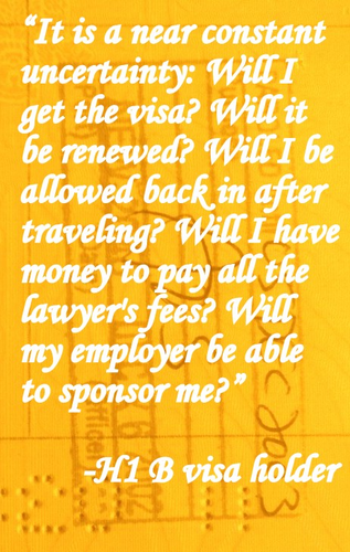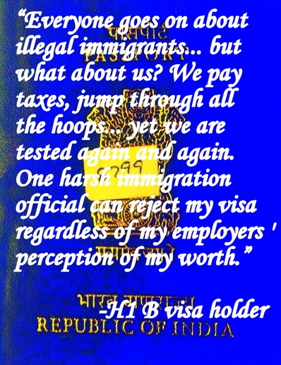 My own impressions were that U.S. society and the economy did not reflect or reward the expertise and the contributions of the H1B visa holders. Sivakumar (2004) refers to some of this resentment and backlash targeted at professional and high tech workers especially from India. In many ways, I felt that the visa tenure was a modern hi-tech manifestation of indentured labor. It constrained employment and professional advancement because the visa was tied to one employer (which is sometimes connected to being paid less than employees who were US citizens). There were social and lifestyle limitations as well that maintained a near constant sense of transience and tenuousness in society. In addition the H1B visa was linked to the employer so there were restrictions on changing jobs. The H1B visa holders pay every tax that any employed citizen is required to do, for benefits that they might never avail of. There are limited opportunities to take loans to buy a home or for education, no social benefits or safety nets (no unemployment benefits, disability benefits etc.), travel restrictions and no right to vote.
