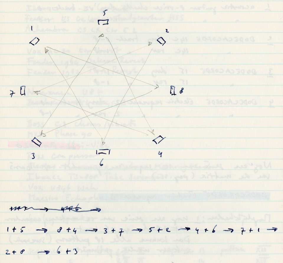 What becomes clear from the list of amplifier/sound-effect combinations shown earlier, is that the distorted guitar sounds appear in E1–F1, whereas A1–D4 are relatively ‘clean’. Eventually it was decided to make 2 groups of 12 sequences, in such a way that the distorted sounds only occur in the second series of 12 sequences.