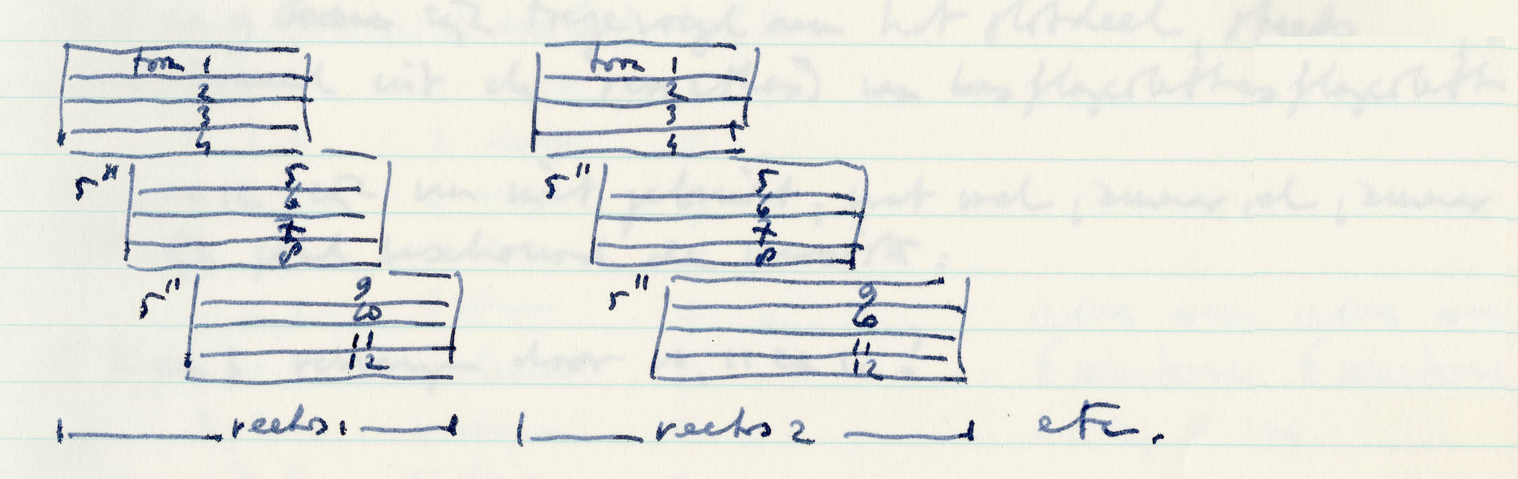 This also explains why tables and matrices are so often used in the descriptions of the production of the material groups for Source Signals 2. These provide the material groups with an underlying structure, which not only ensures cohesion within a material group but also constitutes an investment in the material groups, which pays off as well when (parts of) these groups are combined into larger constellations. The same pitch sequences and numerical constructions underlie these material groups, so that when they (partially) overlap they enter into relationships with each other that are meaningful to me, and, I assume, also to the listener.