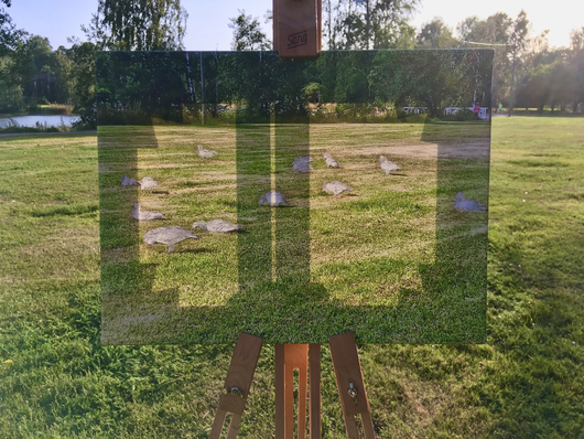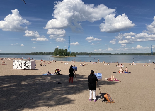Tämä opinnäytteen toinen taiteellinen osa tarkastelee maisemakuvan esittämistä prosessina, jossa visuaalinen kuva ja sen sanallinen kuvailu kietoutuvat toisiinsa. Vuonna 2021 Hietaniemen uimarannalla toteutettu työpaja toimi tilanteena, jossa osallistujat muokkasivat valmista maisemakuvaa sen alkuperäisessä kuvauspaikassa. Keskeinen kysymys on, voiko maisemakuvan poistaminen ja rakenteen purkaminen avata uusia tapoja kokea ja ymmärtää maisemaa ja sen esittämistä.