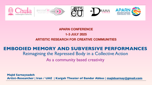 I presented my paper at the Asian Pacific Artistic Research Network 2025 Conference under the theme Artistic Research for Creative Communities. My presentation, titled “Embodied Memory and Subversive Performances: Reimagining the Repressed Body in Collective Action,” explored how the Woman, Life, Freedom movement in Iran has generated a rich archive of embodied protest. Through gestures like group clapping, headscarf-burning, and silent standing, and plural embodied subversion experiences, that inspired from their collective memory, protestors challenged hegemonic gender norms and collectively reimagined femininity through performative resistance. Drawing on field interviews, sensory ethnography, and archive analyze, I reflected on how these subversive performances are shaping new femininity social imaginaries.