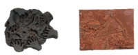 Brent blåleire fra Feiring bruk avdeling Kulmoen, opprinnelig fra Alnabru, blandet med sagflis fra KHiOs treverksted, chamotte og breavsetningssand. Del av relieff til kunst i offentlig rom oppdrag, som feilbrente. Her kuttet igjennom med diamantsag på KHiOs keramikkversted.
