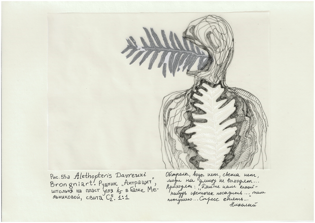 This exposition brings together multiple contexts, narratives and modes of expression to tell multispecies (hi)stories about and from Donbas region, Ukraine, where a military conflict broke out in 2014. By engaging with fossils, paleobotany and testimonies of internally displaced persons, the exposition explores vegetal imaginaries of the region in a series of drawings and questions stories we tell about Donbas and displacement, and ways in which we tell them.