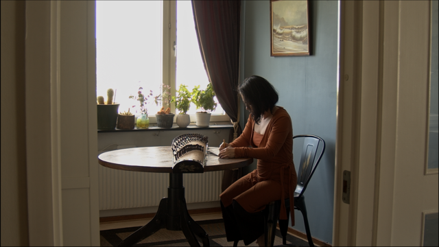 The exposition has two parts. The first, entitled Here, unfolds around discussion about the landscape; the second, called Now, suggests that how time is experienced can affect how one experiences one’s surroundings. The form of the texts correlates to the content, form, and making of the film. The film making text is set in the center of the exposition, and the other discussions push themselves in and spread over the page. Like the text, the film’s continuous timeline is dense and loaded with plural repetitions and conversations. The interlaced reflections and commentaries that characterize the text echo Yousef’s layered performance of time in the film.