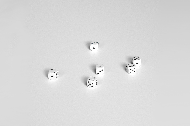 A dice roll is the very image of randomness. Every day since September 1, 1994, I have rolled a set of six dice, written down the number combinations and collected the numerical material in an ever-growing physical archive. The project is entitled "one and one hundred dice rolls a day". I use this numerical material as a starting point for transformations by translating each number, 1 to 6, into one sign, shape, sound or word, and by creating rules for how these translations will be used further. This method shapes the concrete outcomes and results in series or other forms of progressions and connections. What unites the different sub-projects that stem from the dice roll project is an exploration of the inherent nature of this special material and its potential for form, expression, and visibility, as well as a fascination with the diversity and variations generated, and with results I cannot fully predict. In this exposition, I will describe, make visible, and reflect on the working method, process, and the development of the formal language and expressions that have emerged from this ongoing, and in many ways interconnected, artistic project. The project is seen from a place (that of me, the artist's perspective) and is developed from a point (the dice rolls with dots representing numbers).