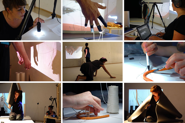 Our research enquiry unfolds through two interconnected aims: we are interested in the nature of ‘thinking-feeling-knowing’ operative within artistic practice, and seek to develop systems of notation (and exposition) for sharing and reflecting on this often hidden or undisclosed aspect of the creative process. Through this specific exposition — Beginnings and Emergences — our intent is to share findings from the prologue phase and year one of our three-year research project Choreo-graphic Figures: Deviations from the Line, during which we have explored how various processes of ‘beginning’ performed within live artistic activity might create the conditions for processes of emergence to arise. The intent is to share some of the ‘figures’ developed within this research project for articulating ‘beginning’ within a collaborative artistic process (e.g. Figure of Circulation, Figure of Shared Vibrations, Figure of Clearing, Ordering and Emptying Out, Figure of Touch and Reaching Towards the Other), alongside reflecting on and attending to the process of emergence within artistic labour itself – a process we have called ‘figuring’. Figuring – we use this term to describe those imperceptible or barely perceptible movements and transitions at the cusp of awareness within the process of “sense-making”: the moments of revelation, epiphany, synchronicity, of change in tack or direction or pace, the decision to stop, do something different, begin again. Figuring manifests within those threshold moments within the creative process that are often hard to discern but which ultimately shape and steer the direction of the evolving activity. Our research involves cultivating practices of attention (a perceptual heightening, hyper-sensitizing, sharpening of alertness) for noticing these emergent figurings within the process of creative activity, and devising systems of notation for identifying, marking and even tentatively naming these processes of emergence.