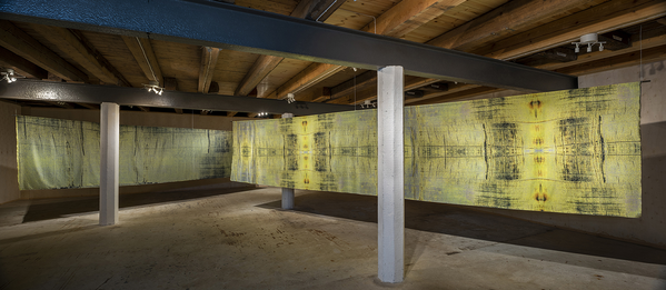 Colors are experiences of light, on surfaces that hit the eye with different wavelengths. Digital solarization evens out and inverts the colors. A small, superfluous, torn off silk remnant from a hand-printed textile work is the starting point for this two two-sided digitally printed textiles. Colors lose their brillians and darken in step with the light. No darkness without light, no shadow without sun. Two sides of the same coin.