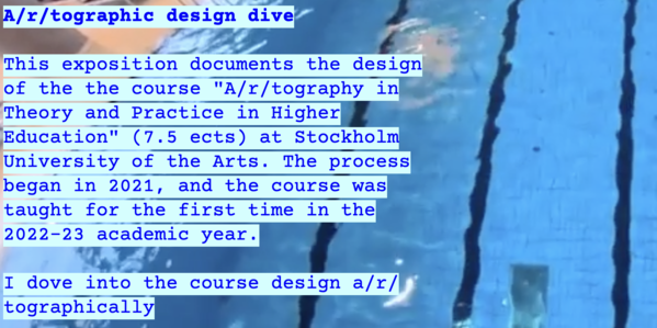 This exposition is part of the peer-reviewed article: Østern, T. P., Reppen, C., O’Connell, S., & Daneberg, M. (2025). Choreographer/researcher/teacher: Developing a/r/tography as an approach to dance pedagogy at Stockholm University of the Arts in a professional learning community of teachers. Nordic Journal of Art & Research, 14(2). https://doi.org/10.7577/ar.5460 This exposition explores my a/r/tographic design dive as course coordinator of the course "A/r/tography in theory and practice in higher education" (7.5 ects) at Stockholm University of the Arts. The decision to create and offer this course arose from a large collaborative change project at the former Department for Dance Pedagogy. The project led to a revision of the BA in Dance Pedagogy into an a/r/tographic study program, emphasizing the entangled roles of choreographer, researcher, and teacher. The course was developed to support professional development in a/r/tography for staff teaching across arts disciplines in higher education. As course coordinator, I dove into the course design a/r/tographically.