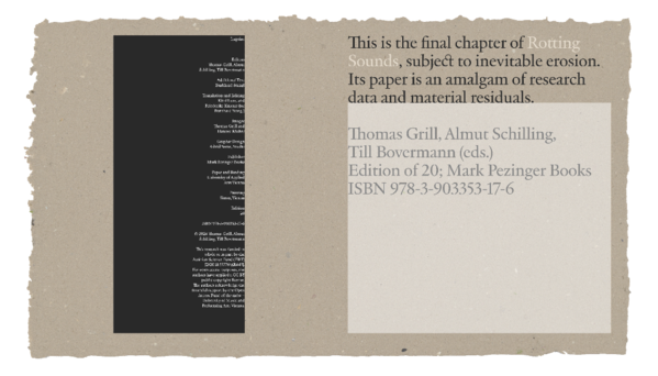 The text by Thomas Grill refers to some of the key points of the Rotting Sounds research project and celebrates the open-ended nature of the experimental research.