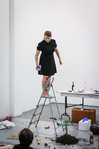 In her video performance Alphabet of Performance Art Leena Kela performs with the materials and objects that are typical for performance art. The work is based on over 15 years of research within the art form. She has selected 26 different materials and objects that form the language of the performance art and will perform them from A to Z. If A is an apple, what do you think P could be? Paint, paper, piss?