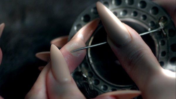 The piece employs haptic-visuality, emphasising the tactile experience of the brooch’s needle piercing the skin, creating a visceral connection for the viewer. Close-up shots and textural details enhance the sensory impact, making the act of penetration both symbolically and physically felt. This multisensory approach intensifies the emotional resonance of the ritual, transforming the brooch into a charged object within a speculative, magical context.