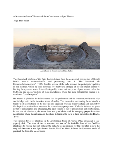 The theoretical wisdom of the Epic theater derives from the conceptual perspective of Bertolt Brecht toward communication and performing arts in "Der Rundfunk als Kommunikationsapparat" (1932). Brecht's version of the radio reminds the participatory politics in the internet, which he later theorizes for theatre-qua-critique of the aristotelian drama of binding the spectator to the fiction ideologically, in the vicious cycles of pre- learned codes, the traditional and phony wisdoms of clans and classes, where the mere potential for change is to turn into a "petit bourgeois".