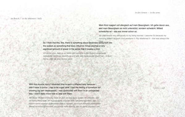At the beginning were conversations. Five colleagues and friends were interviewed individually for sixty minutes each in a semi-structured format. The artists, curators, and theorists engaged with the questions on weakness and weakening unprepared and spontaneously, for which we, Lisa Hinterreithner and Markus Gradwohl, are very grateful. The questions revolved around experiences of weakness: moments of exposure and hesitation, of dependence and refusal, of care, fatigue, and withdrawal. The participants form a cross-generational group who understand themselves as more or less privileged queer and non-queer Europeans.