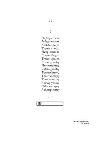 The theory & practice affair: this is piece "16" from the series "x out of 5448643200", and it is an arrangement of 16 possible combinations among 5448643200 available of the letters {p, r, a, c, t, i, c, e, t, h, e, o, r, y}. These letters make the word 'practicetheory', and also the word 'theorypractic'e. In fact, none of these two words exist, and yet are identifiable 'theory' and 'practice' as constitutive halves within them. Discourse not only describes the world but actually produces the world. We, as researchers and as artists - and particularly as artist-researchers - are in permanent tension with the two blocks, theory and practice, and despite our struggles to merge both, we are, through language, every time referring to one after the other. One after the other, in a hierarchy. We cannot speak the two words at the same time and, unless we invent a new word to refer to the crossbreed of the two, we are condemned to this limiting dichotomy. "x out of 5448643200" presents the hypothesis of billions of possibilities to re-write the productive merging of theory and practice. "16" shows sixteen of them (Thanks to Steve Norton and Robert Stevenson for collaboration)