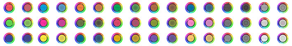 This exposition presents 48 colour maps signifying the hue, saturation and brightness (HSB) differences between a screen colour and the resulting colour outcome when printing onto fabric with a digital inkjet textile printer. Each map is a 360 degree hue colour circle that has inner rings decreasing in saturation and brightness.