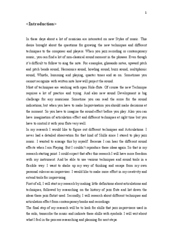Name: Yoojin Ko Main Subject: Jazz Flute Research Coach: Jarmo Hoogendijk Title of Research: Different Techniques and Articulations effect for the flute improviser Research Question: How to discover different techniques and articulations for improvising on the flute Research Process: I figured out different techniques and Articulations. I made detailed observation for these kinds of skills and arranged this by myself. This process began because I can hear the different sound effects when I am playing, but I could not reproduce these ideas each time. I expect that after this research I will have more freedom with my instrument and be able to use various techniques and sound tools in a flexible way. I want to shake up my way of thinking and escape from my own personal rules as an improviser. I started my research by making little definitions about articulations and techniques, followed by researching on the history of jazz flute and listing the ideas these jazz flute players used. I researched about different techniques and articulation effects from contemporary books and recordings. The final step of my research was to look for skills that jazz improvisers used in their solos, to transcribe the music and indicate these skills with symbols. Summary of Results: I came to realize that I did not know the full details of all the different techniques and articulations needed for improvising. Each musician has their own unique way of improvising and their musical abilities and their environment influence their development of their techniques and articulations. To be able to improve in good musical context, I had to master his/her techniques and articulations. Also I have to be aware of when I am using the different techniques such as the alternative fingerings and tone-color trills during my performance. I have to achieve clean and fine techniques to be able to play the different ideas that comes to mind with a flexible techniques and articulations. I would like to try to compose songs with different techniques and articulations. I want to put special techniques and different articulations in these tunes so that I also can learn from it and increase my individual colorations. Eventually when I improvise, I want to be able to express all of my emotions with good musical control. All through my research I dreamed that I want to be flexible and free with my flute playing in the near future and I am certain that I can achieve it with this research.